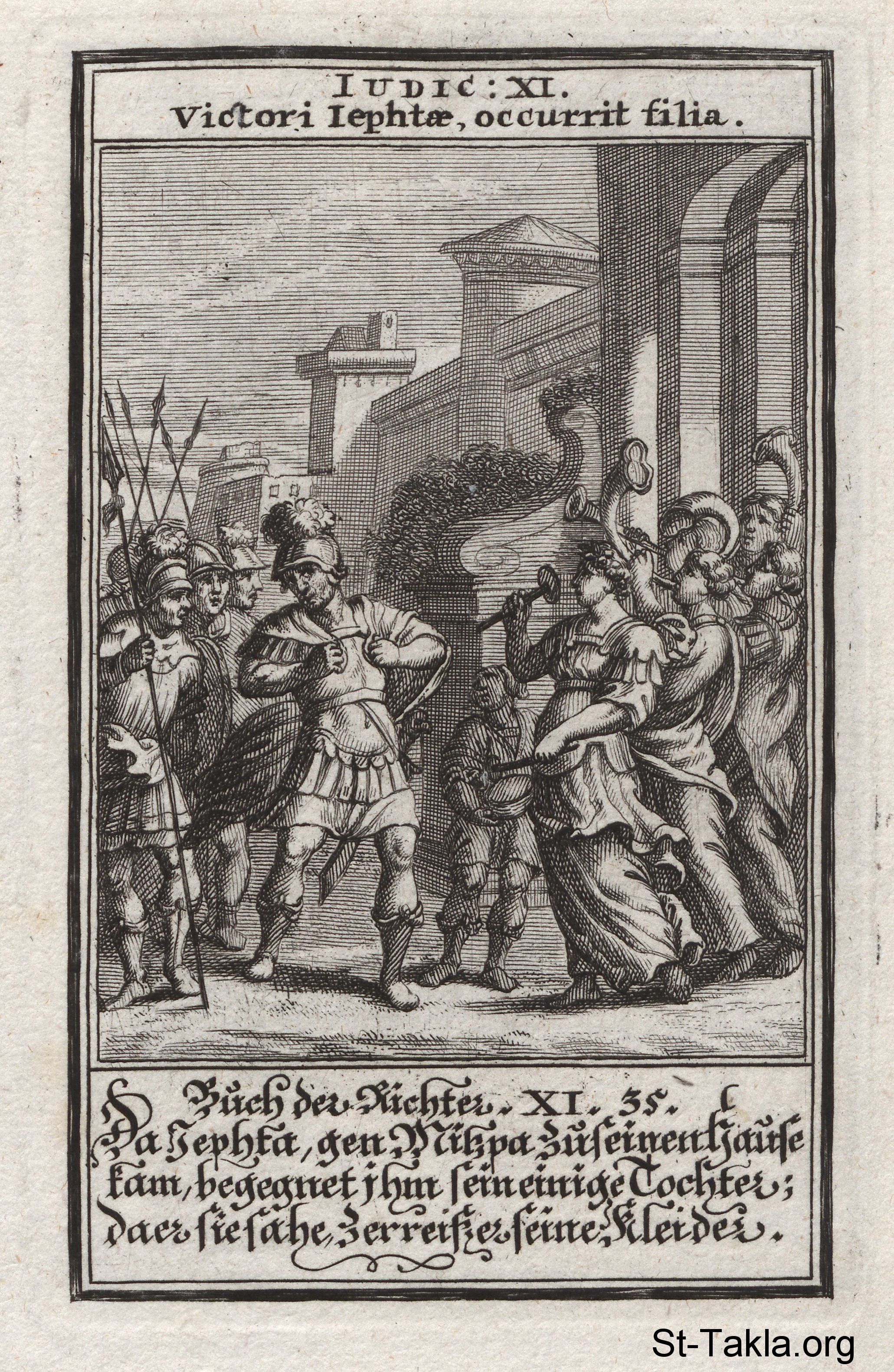 Jephthah's Daughter: Jephthah’s daughter is the first to greet him when he returns from victory: (Judges 11) - from the book: Biblia Ectypa (Pictorial Bible), by Johann Christoph Weigel, 1695.
