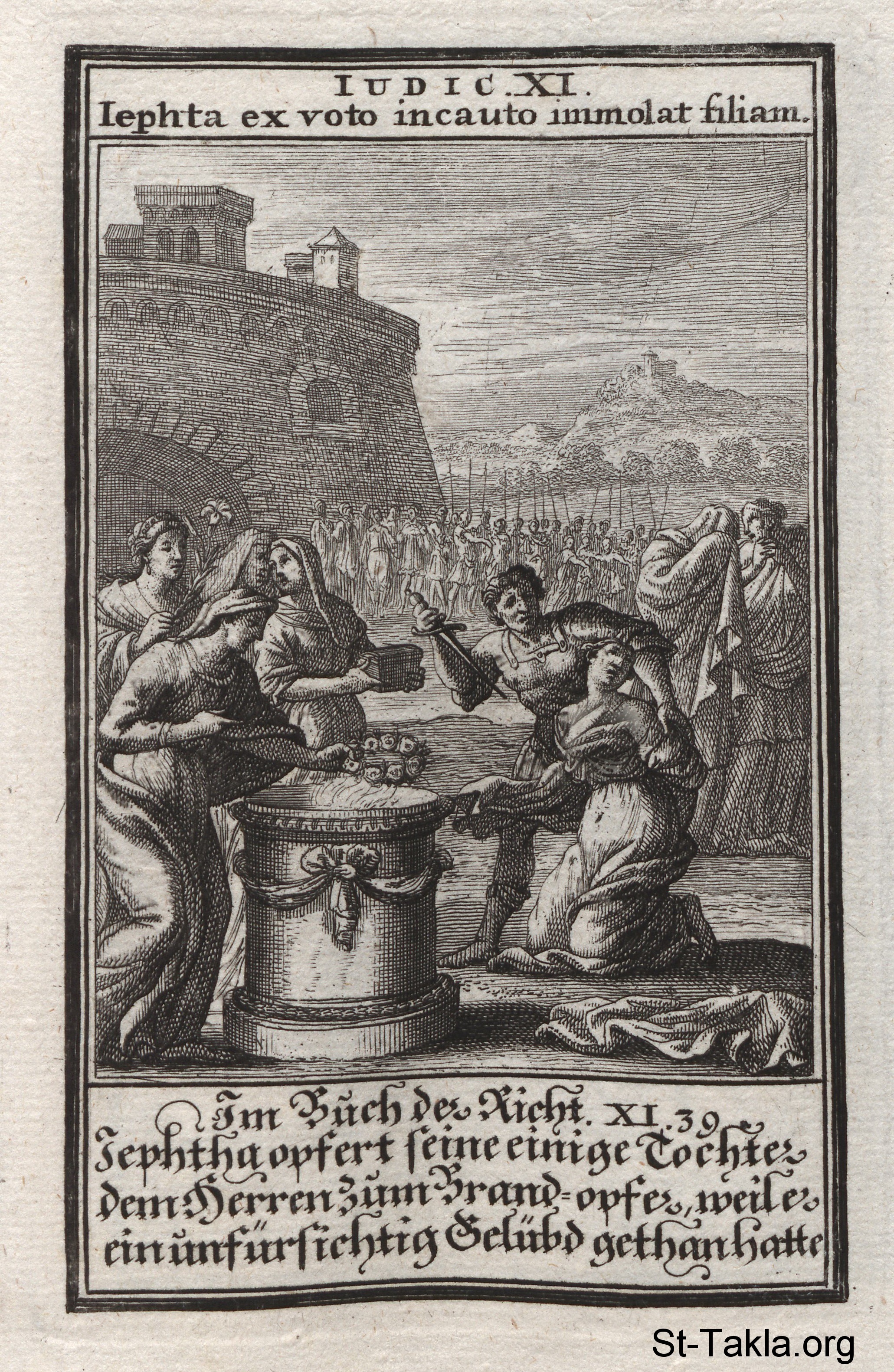 Jephthah Sacrifices his Daughter: Jephthah’s fulfills his vow by sacrificing his daughter to the God: (Judges 11) - from the book: Biblia Ectypa (Pictorial Bible), by Johann Christoph Weigel, 1695.