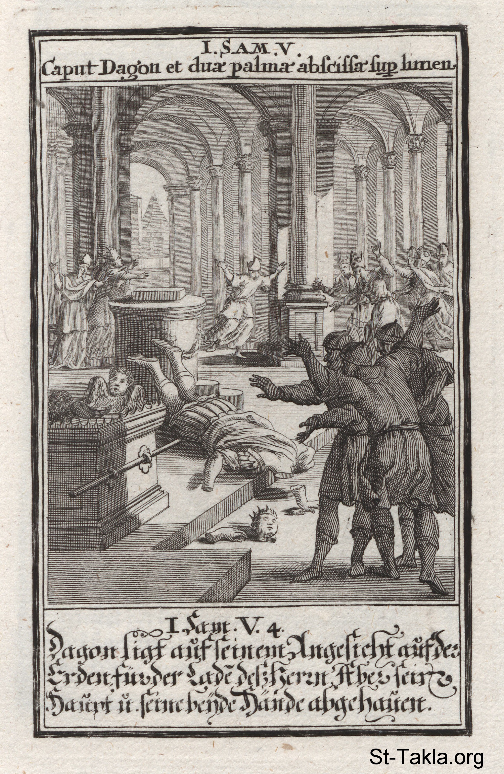 Temple of Dagon: The priests of the Temple of Dagon discover the idol destroyed, after leaving the Ark of the Covenant in the temple overnight: (1 Samuel 5) - from the book: Biblia Ectypa (Pictorial Bible), by Johann Christoph Weigel, 1695.
