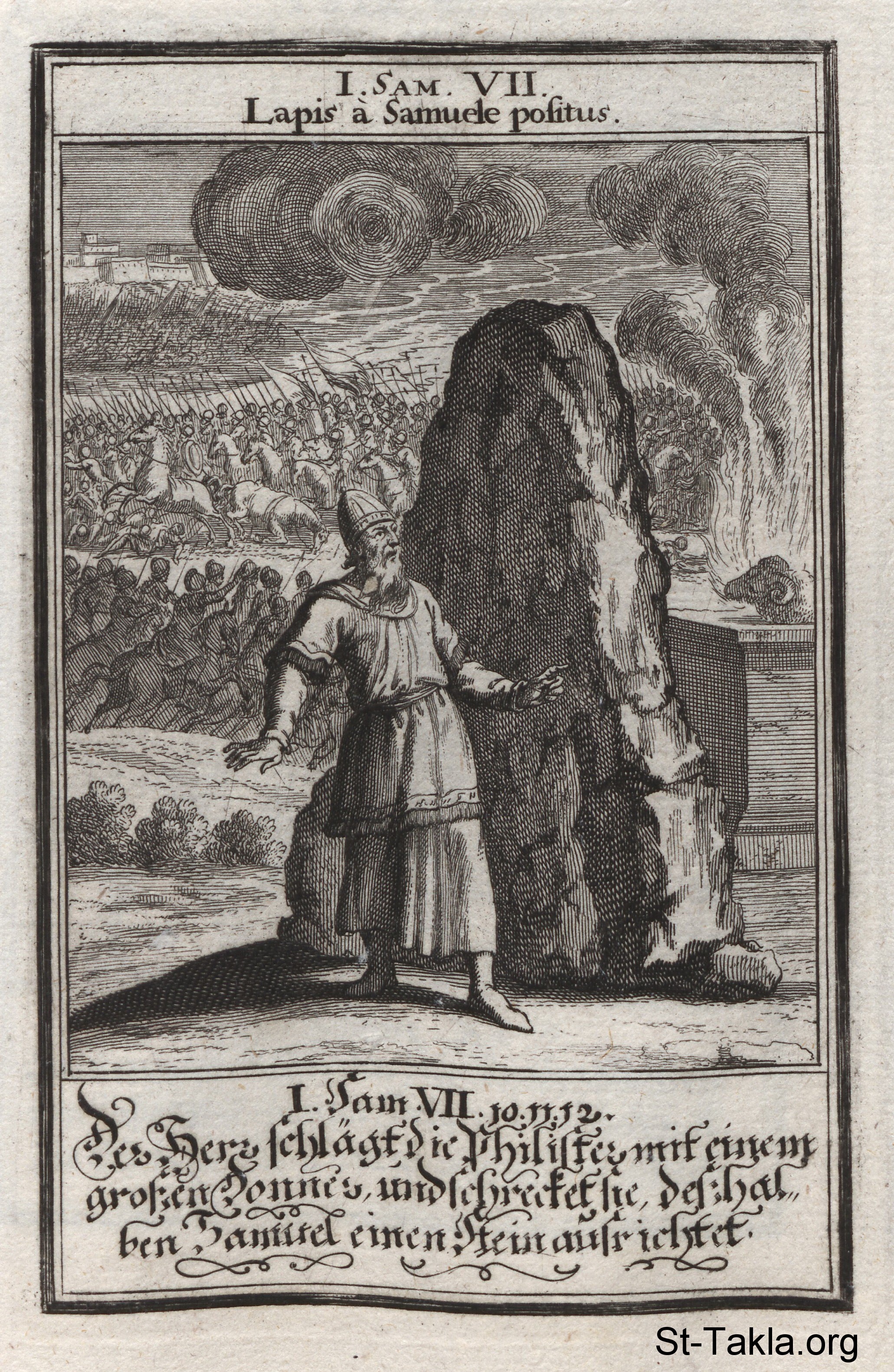 ذبيحة صموئيل وهزيمة الفلسطينيين: يهزم بنو إسرائيل الفلسطينيين في معركة المصفاة، حيث يقدم صموئيل ذبيحة لله: (صموئيل الأول 7: 5-14) - من كتاب: الكتاب المقدس المصور، يوهان كريستوف فيجيل، 1965 م.