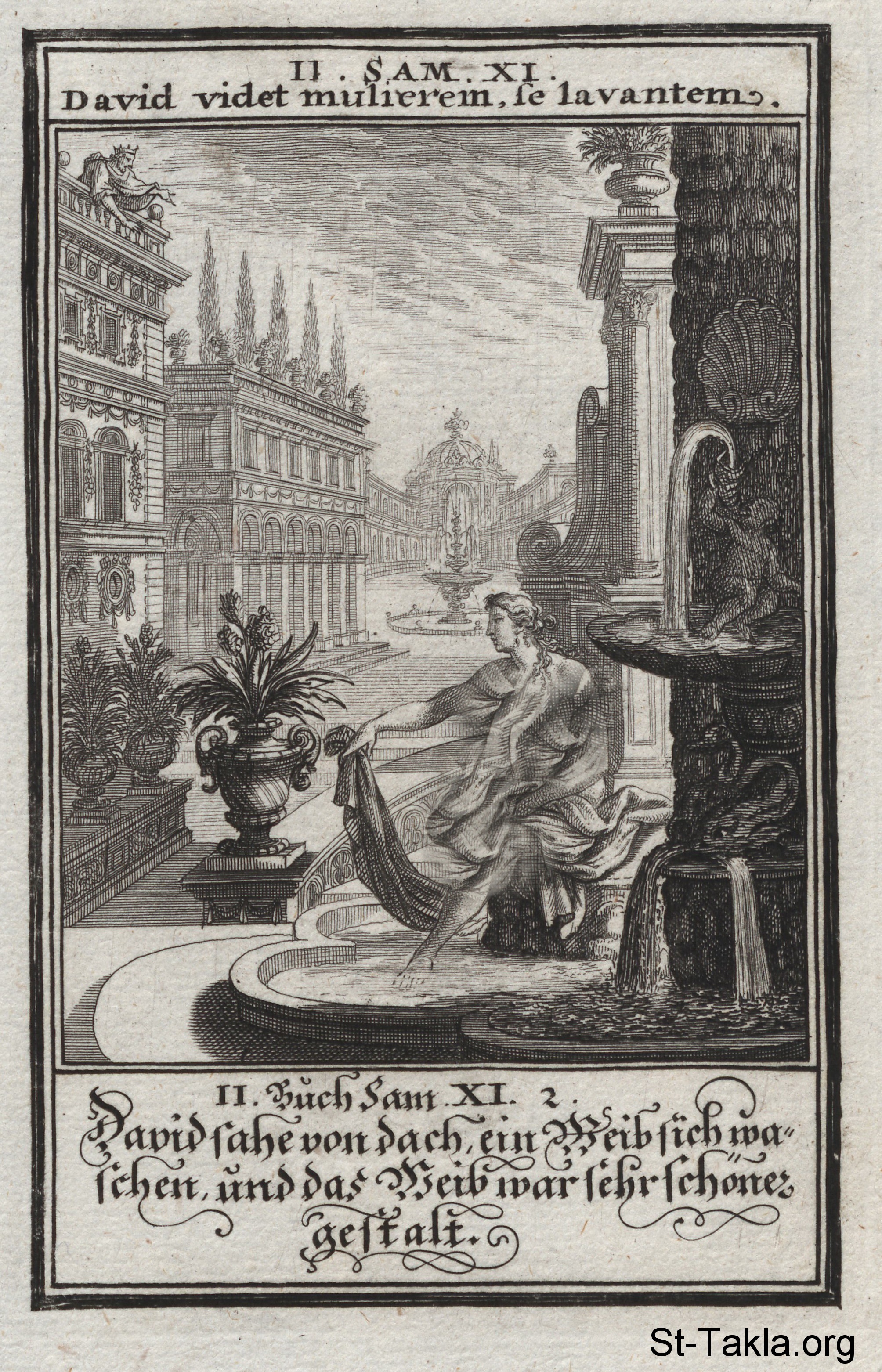 David and Bathsheba: As David looks down from a palace balcony, Bathsheba bathes in a pool: (2 Samuel 11) - from the book: Biblia Ectypa (Pictorial Bible), by Johann Christoph Weigel, 1695.