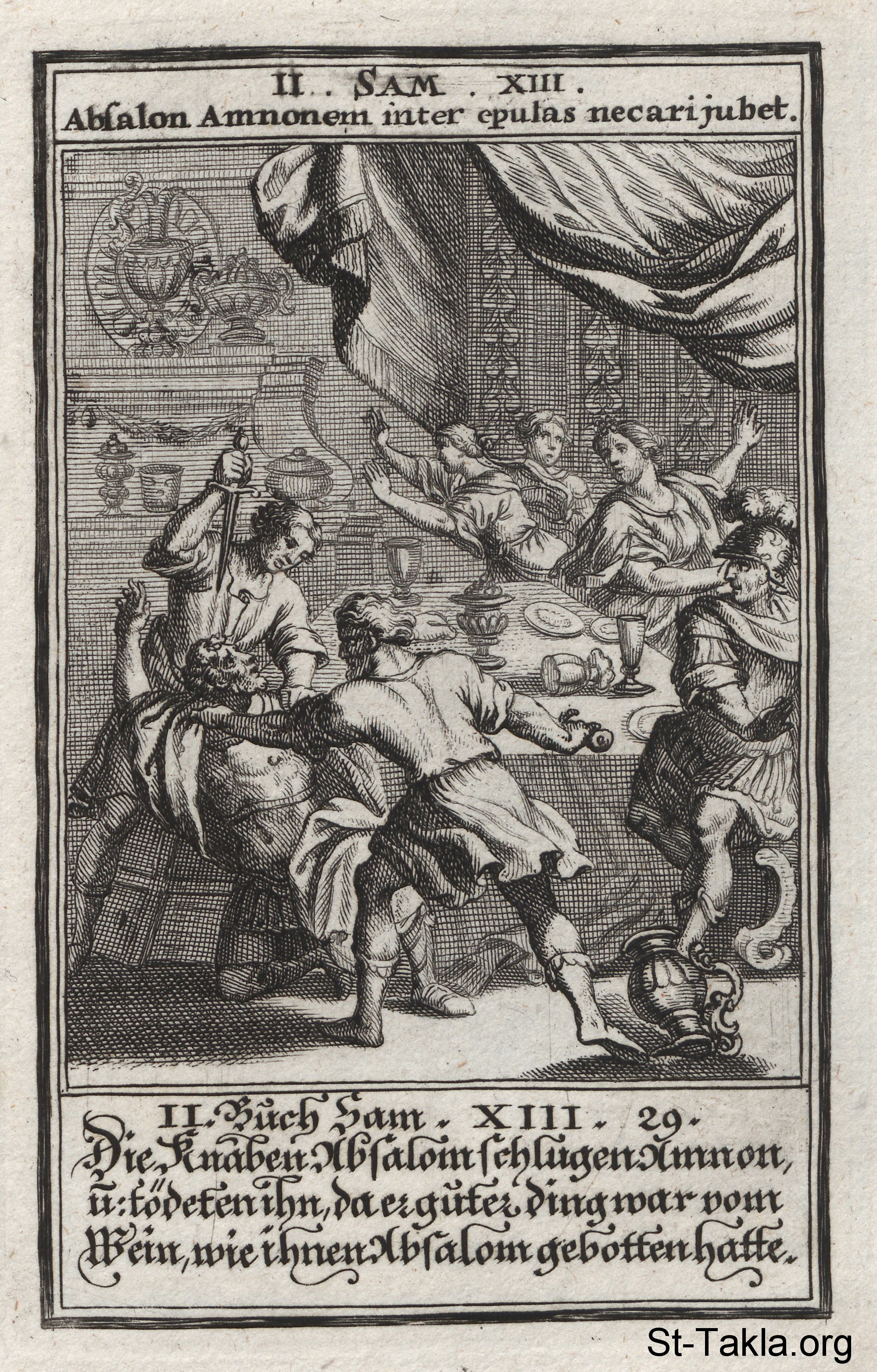 Death of Amnon: Absalom has Amnon assassinated during a dinner party in order to avenge his sister Tamar's rape: (2 Samuel 13) - from the book: Biblia Ectypa (Pictorial Bible), by Johann Christoph Weigel, 1695.