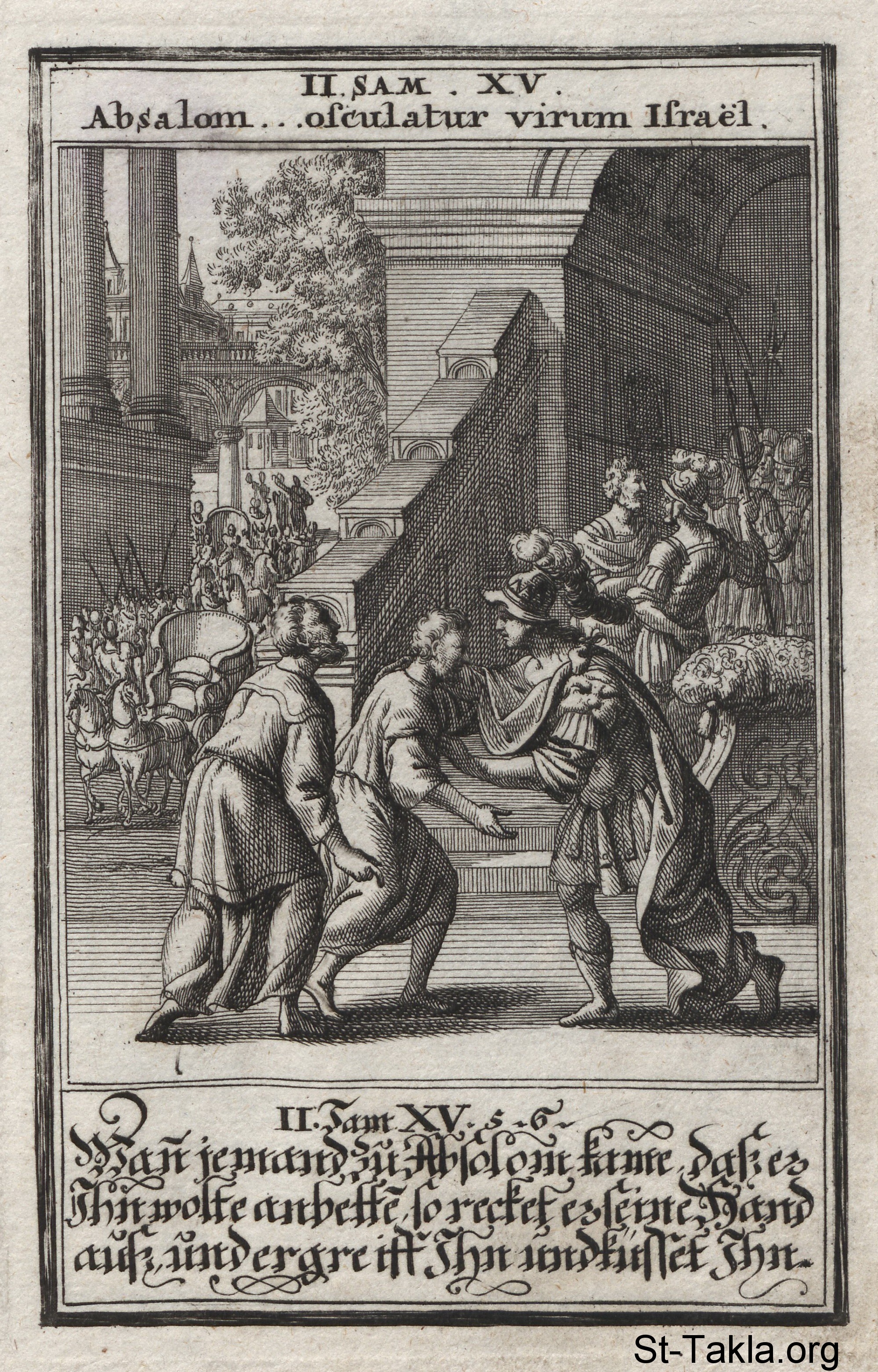 خطة أبشالوم: أبشالوم يسمع شكاوى الناس ليقوم بالثورة على داود: (صموئيل الثاني 15) - من كتاب: الكتاب المقدس المصور، يوهان كريستوف فيجيل، 1965 م.