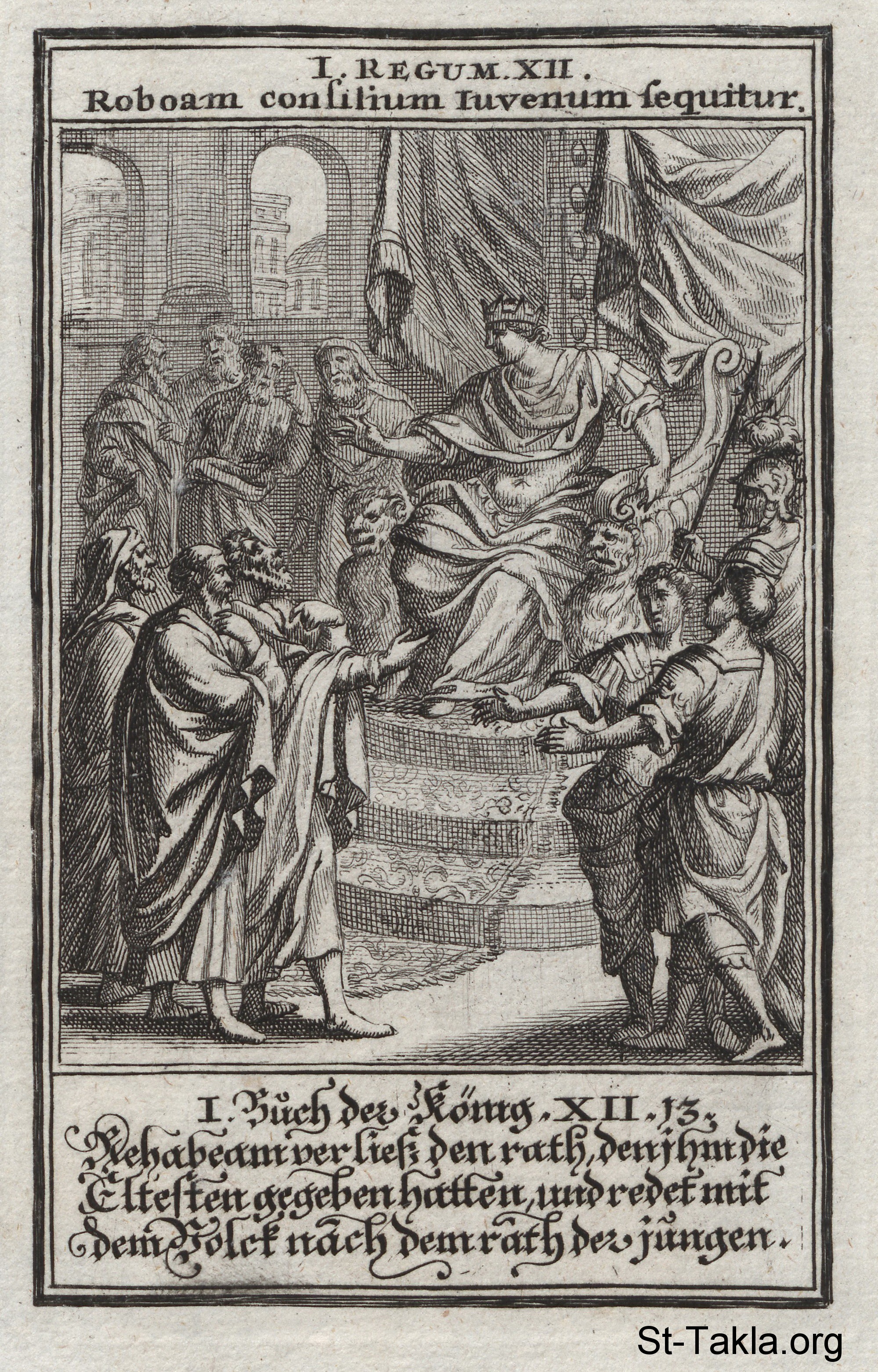 Rehoboam Seeks Advice: Rehoboam follows the advice of the young men rather then the elders: (1 Kings 12) - from the book: Biblia Ectypa (Pictorial Bible), by Johann Christoph Weigel, 1695.