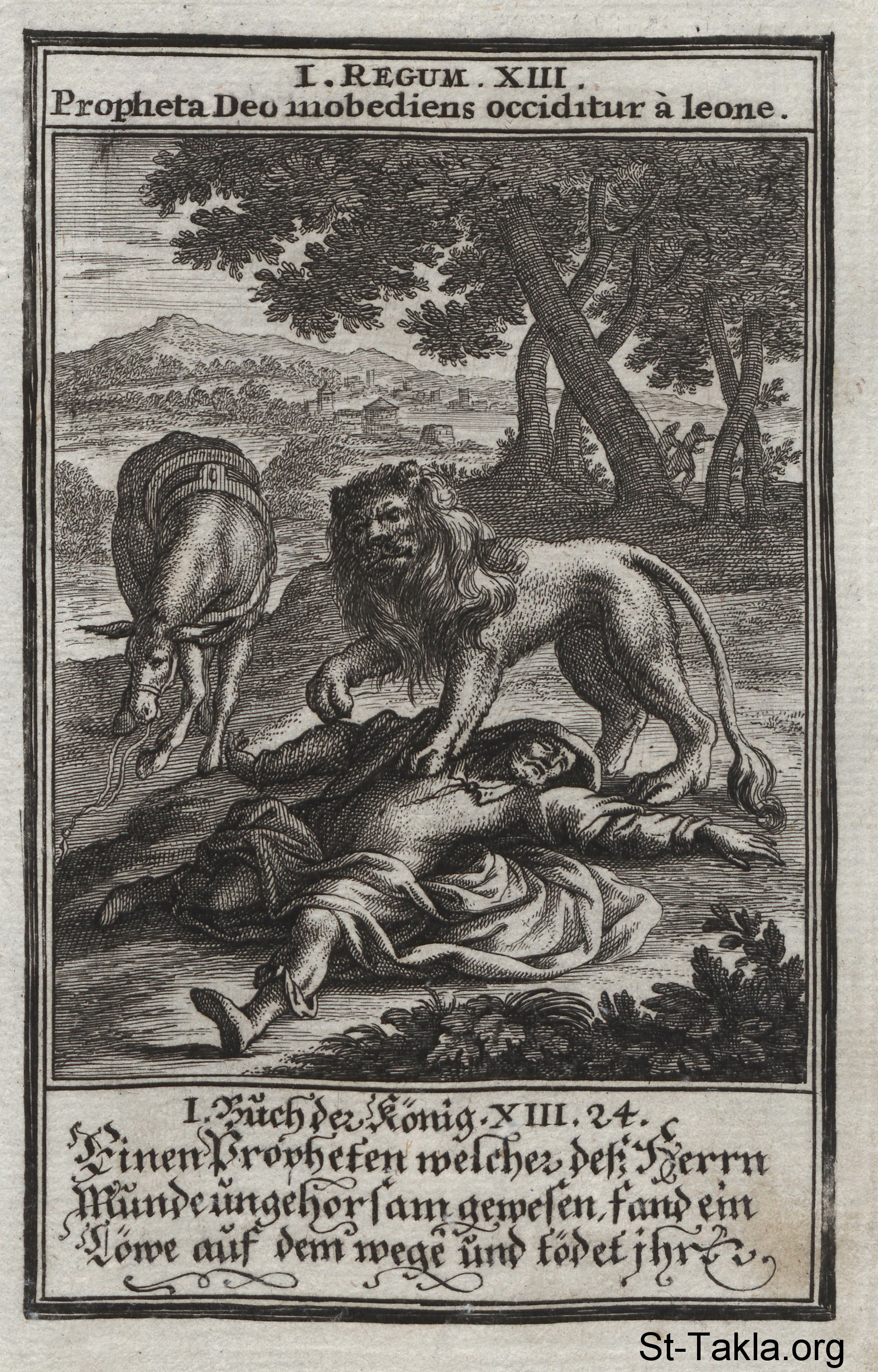 A Lion Slays the Man of God: The man of God is killed by a lion for failing to obey God's command: (1 Kings 13) - from the book: Biblia Ectypa (Pictorial Bible), by Johann Christoph Weigel, 1695.