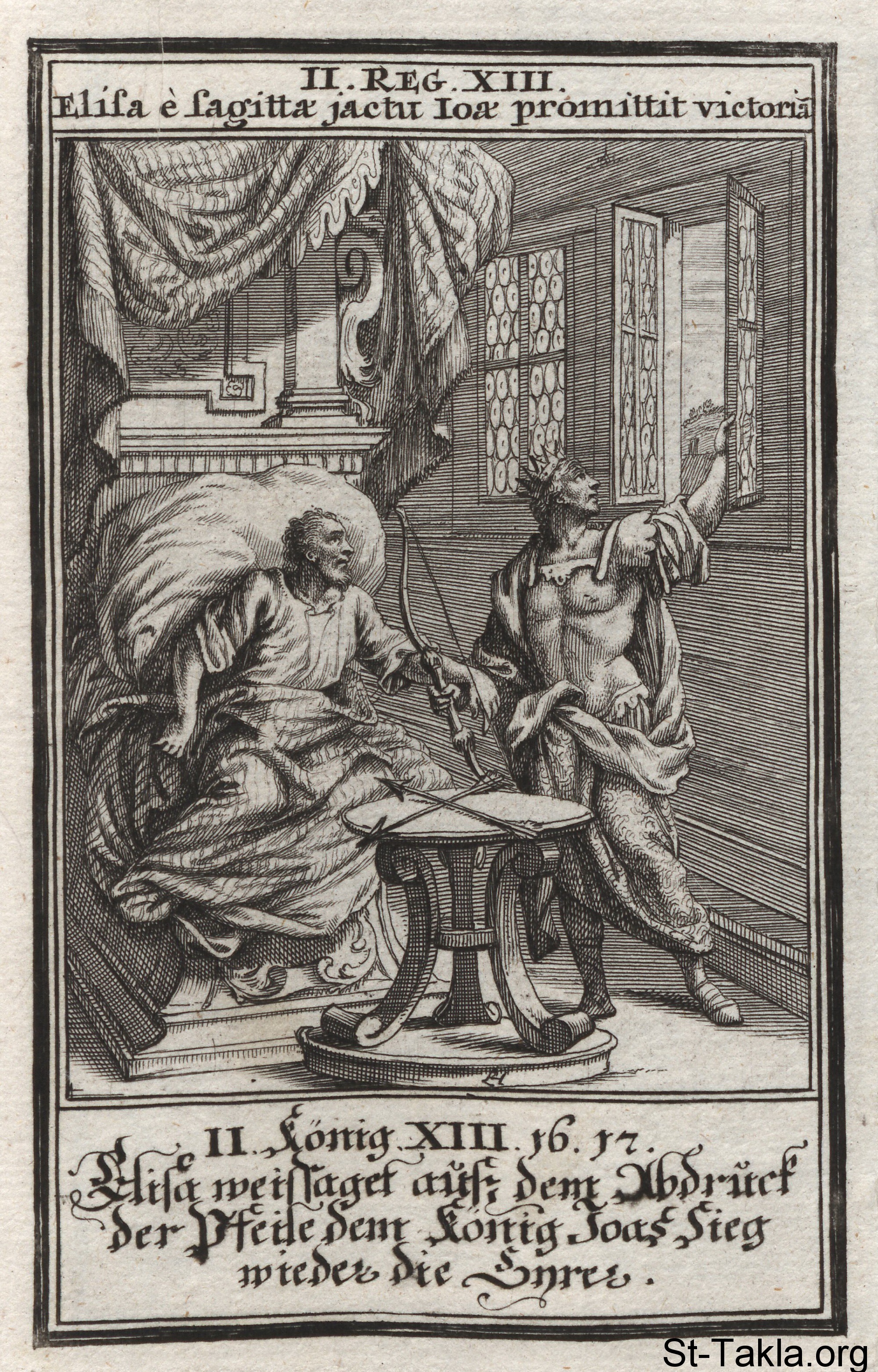 Elisha Prophesies Victory for Jehoash: Elisha has Jehoash shoot an arrow out an open window, whereby he proclaims victory for Israel: (2 Kings 13) - from the book: Biblia Ectypa (Pictorial Bible), by Johann Christoph Weigel, 1695.