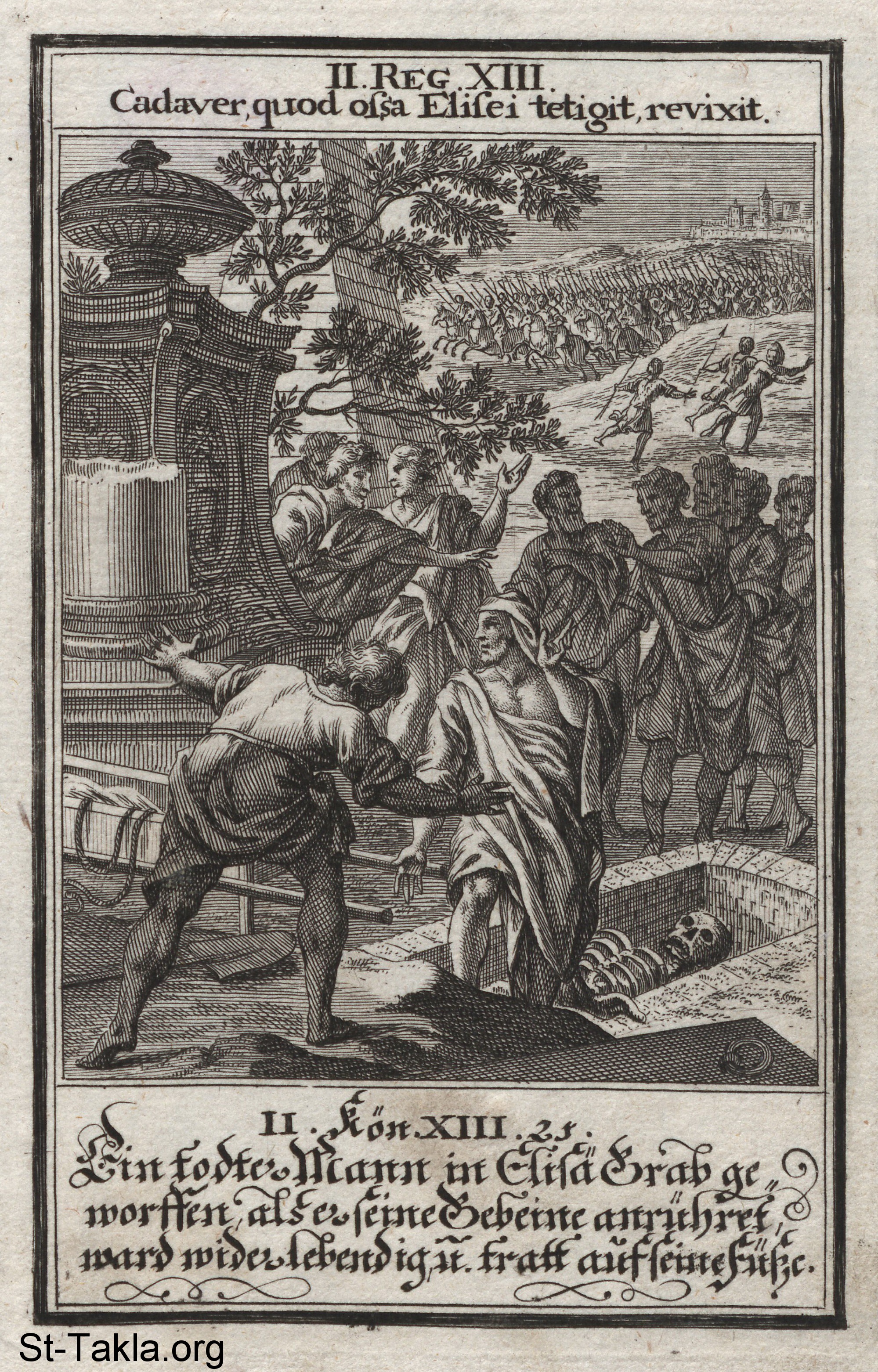 Elisha's Bones Resurrect the Dead: A man is resurrected upon being thrown in Elisha's tomb during a raid of Moabites: (2 Kings 13) - from the book: Biblia Ectypa (Pictorial Bible), by Johann Christoph Weigel, 1695.
