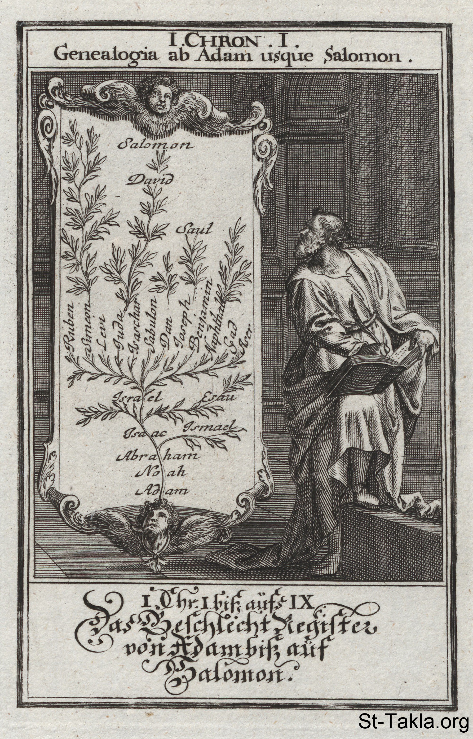 سلسلة الأنساب من آدم إلى سليمان حسب سفر أخبار الأيام الأول - من كتاب: الكتاب المقدس المصور، يوهان كريستوف فيجيل، 1965 م.