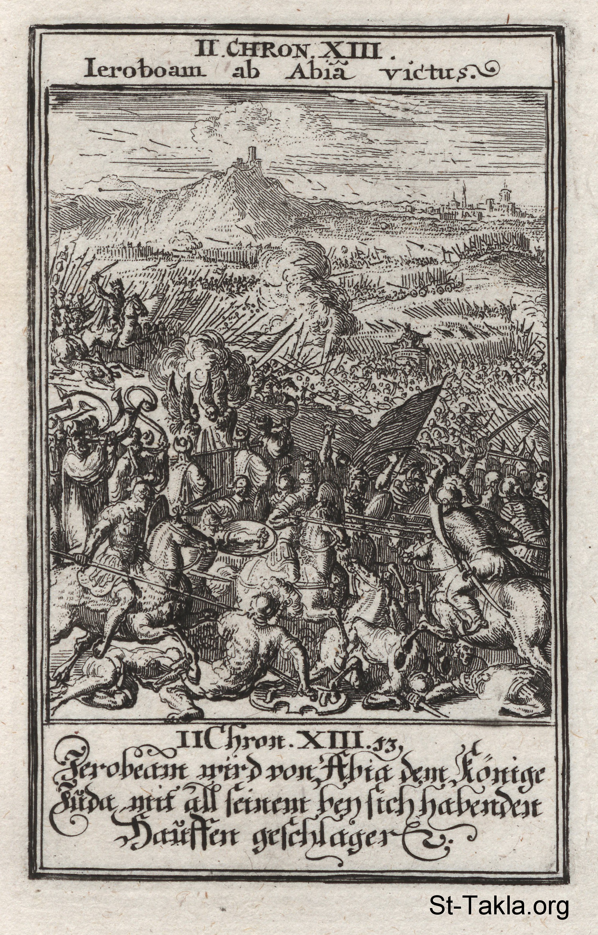 War Between Jeroboam and Abijah: King Abijah of Judah attacks King Jeroboam of Israel: (2 Chronicles 13) - from the book: Biblia Ectypa (Pictorial Bible), by Johann Christoph Weigel, 1695.