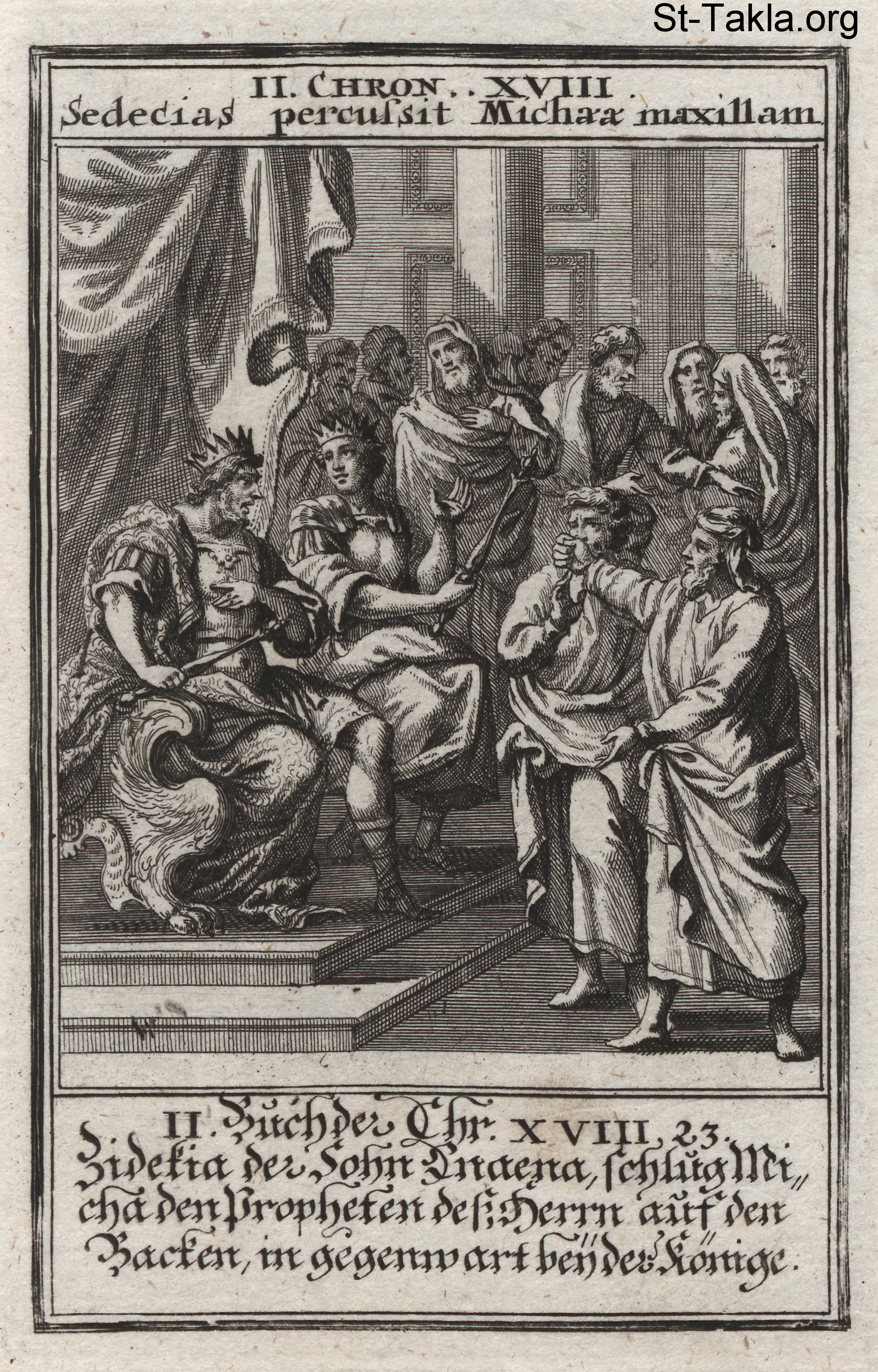 Ahab and Jehoshaphat Seek Counsel: The prophet Micaiah son of Imlah prophesies before King Ahab of Israel and King Jehoshaphat of Judah that they will not be successful in retaking Ramoth-Gilead from the King of Aram. The prophet Zedekiah son of Chenaanah stands next to Micaiah with iron horns preparing to strike him: (2 Chronicles 18) - from the book: Biblia Ectypa (Pictorial Bible), by Johann Christoph Weigel, 1695.