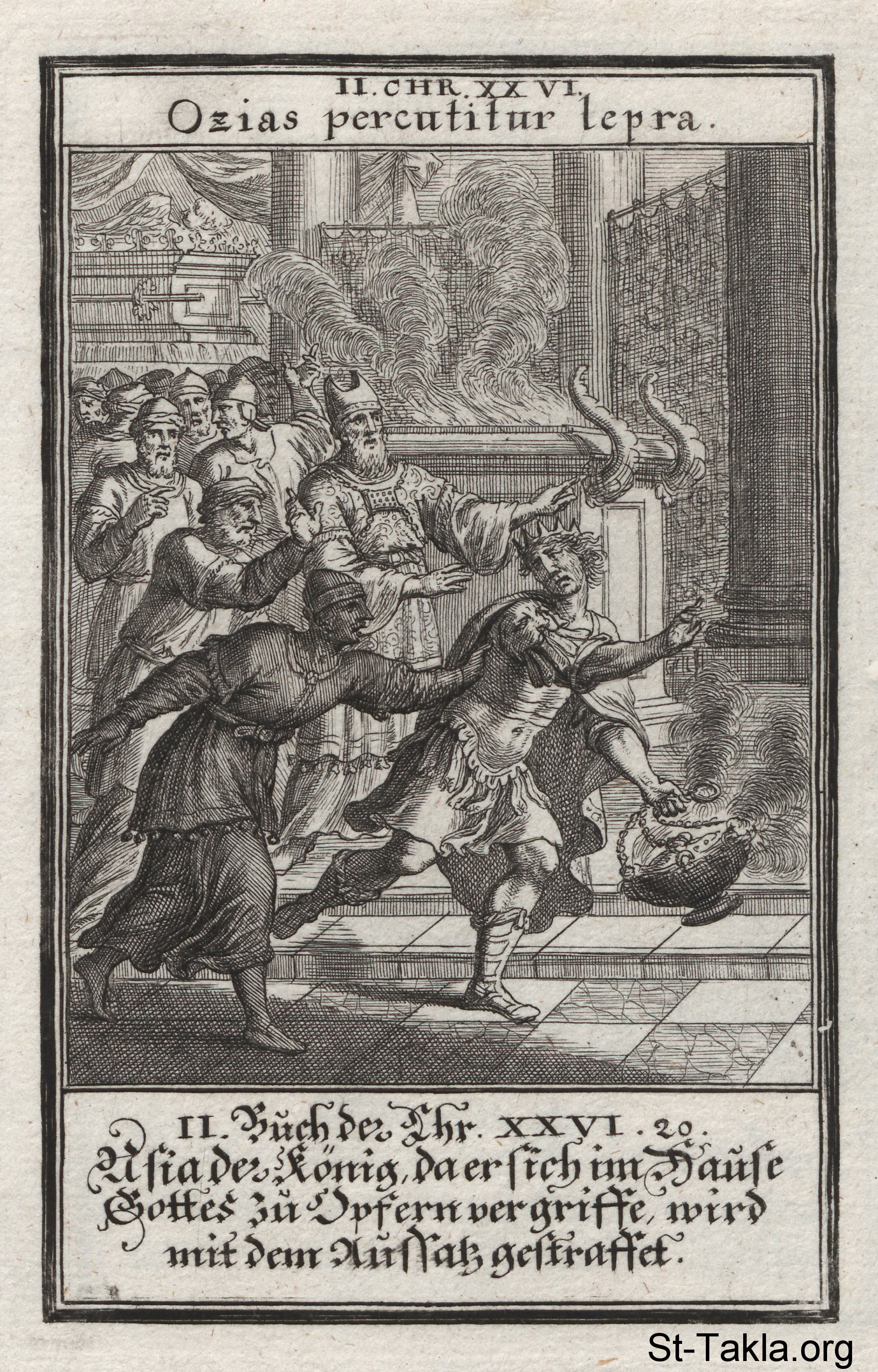 Uzziah the Leper: Uzziah is given leprosy by God for being unfaithful, and thus is rushed out of the temple: (2 Chronicles 26) - from the book: Biblia Ectypa (Pictorial Bible), by Johann Christoph Weigel, 1695.