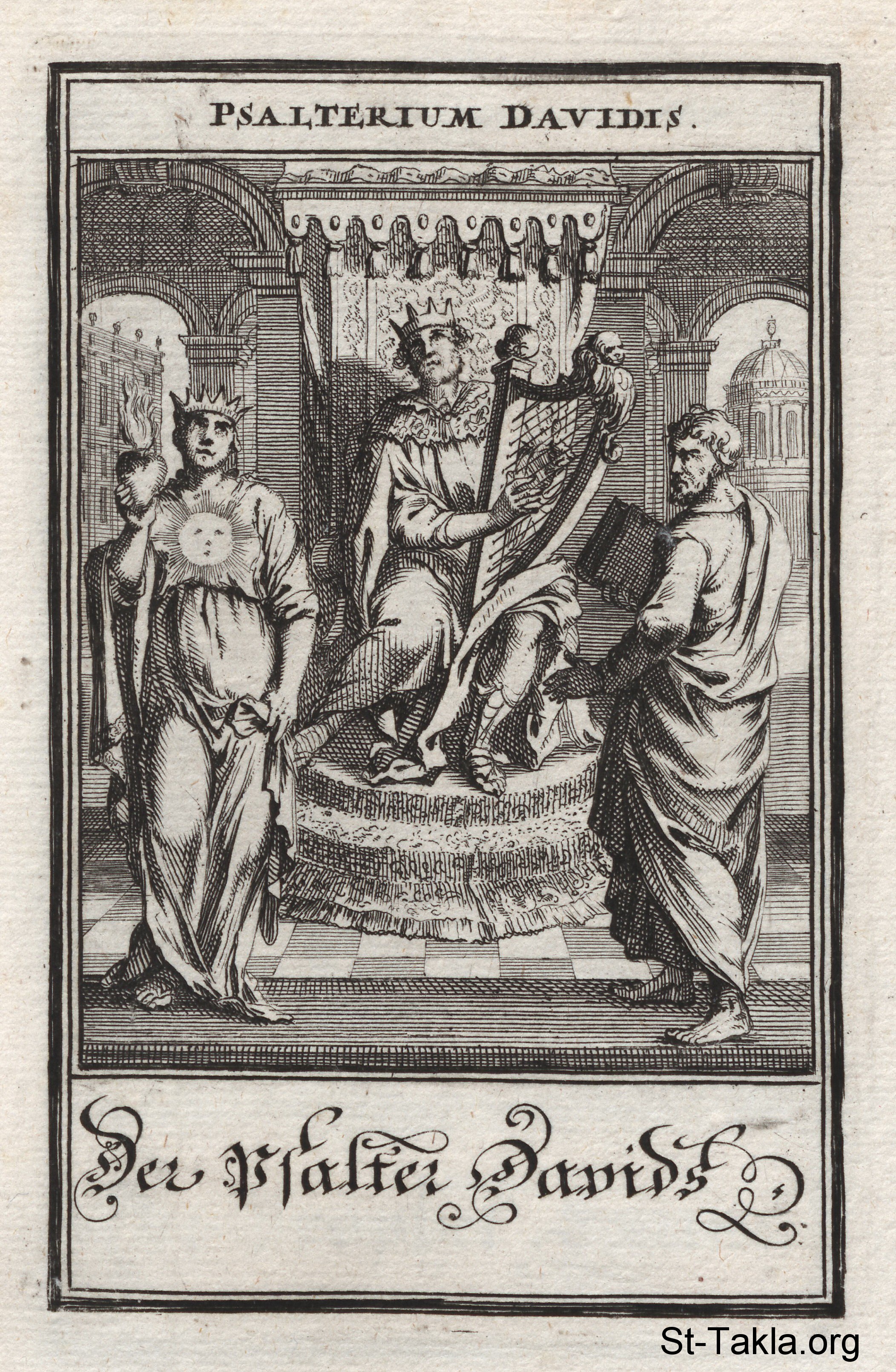 سفر مزامير داود: داود المرنم: الملك داود جالسا على عرشه ومعه قيثارته، ويحيط به شخص يحمل كتابا (سفرا) وامرأة تحمل قلبا مشتعلا - من كتاب: الكتاب المقدس المصور، يوهان كريستوف فيجيل، 1965 م.