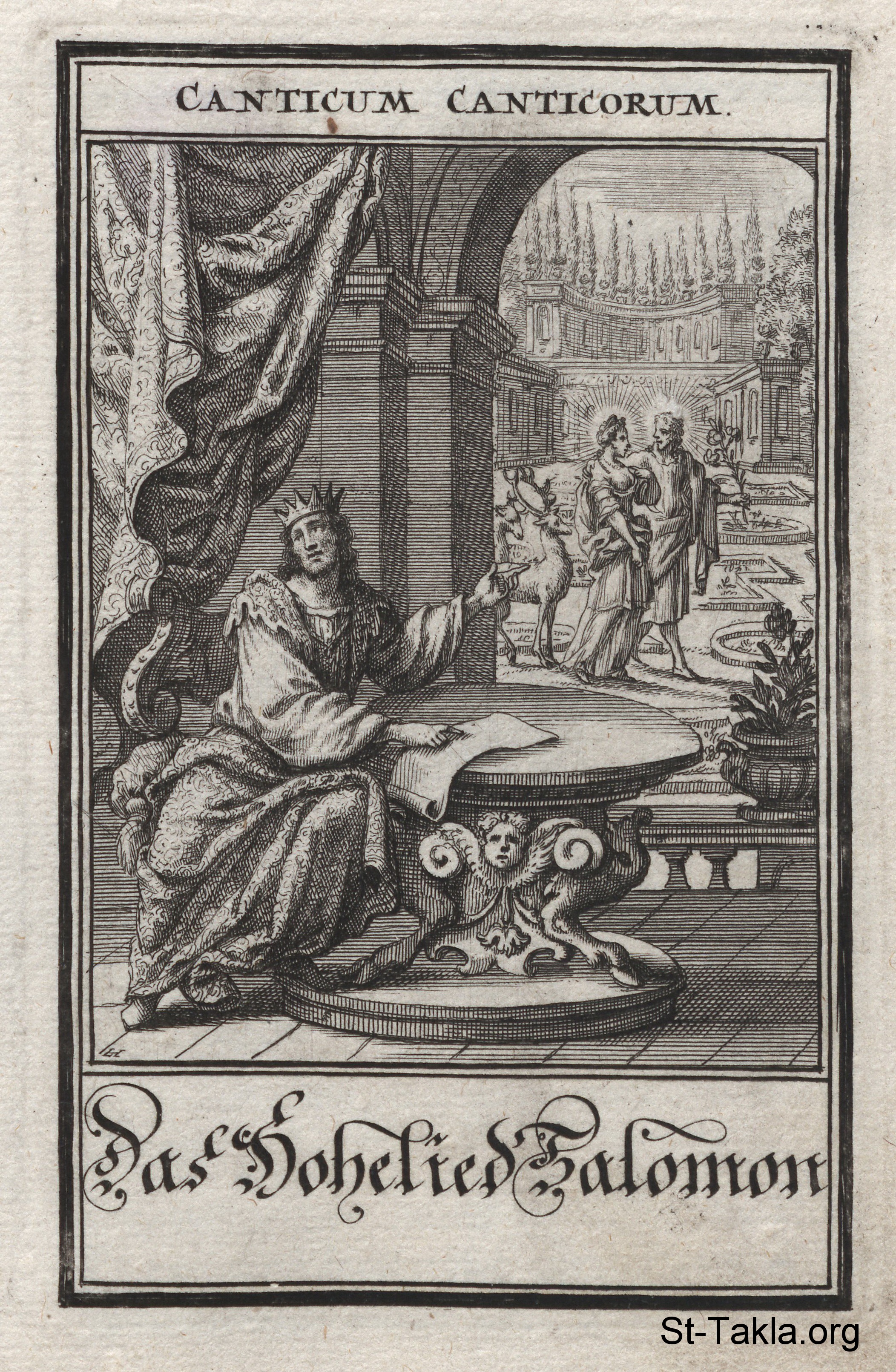 سفر نشيد الأنشاد: سليمان الملك يكتب سفر النشيد، ويُرى في الحديقة بعض الرموز من السفر - من كتاب: الكتاب المقدس المصور، يوهان كريستوف فيجيل، 1965 م.