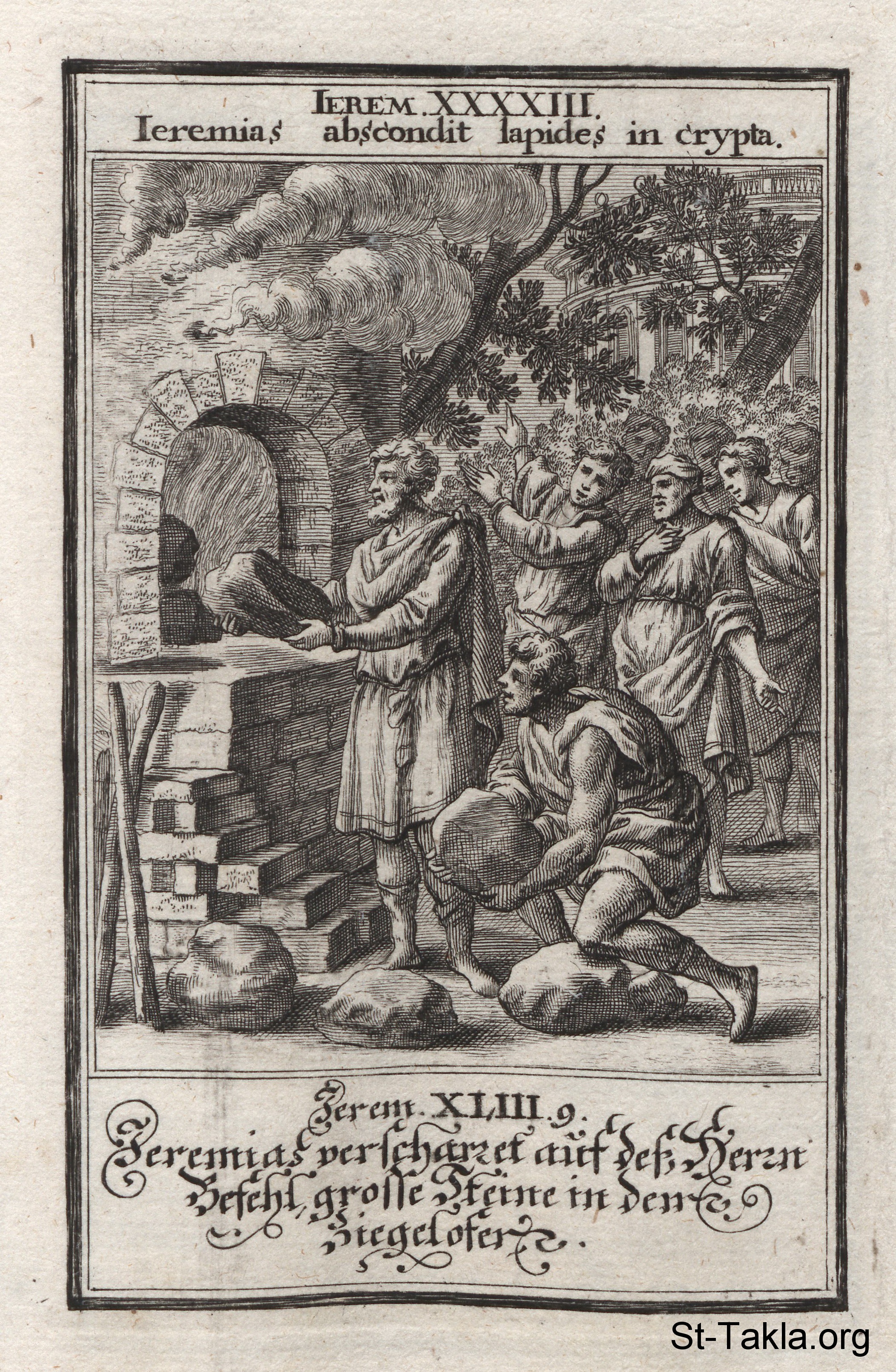 Jeremiah Burns Stones: Jeremiah burns large stones in the furnace as a sign of Nebuchadnezzar’s capture of Jerusalem: (Jeremiah 43) - from the book: Biblia Ectypa (Pictorial Bible), by Johann Christoph Weigel, 1695.