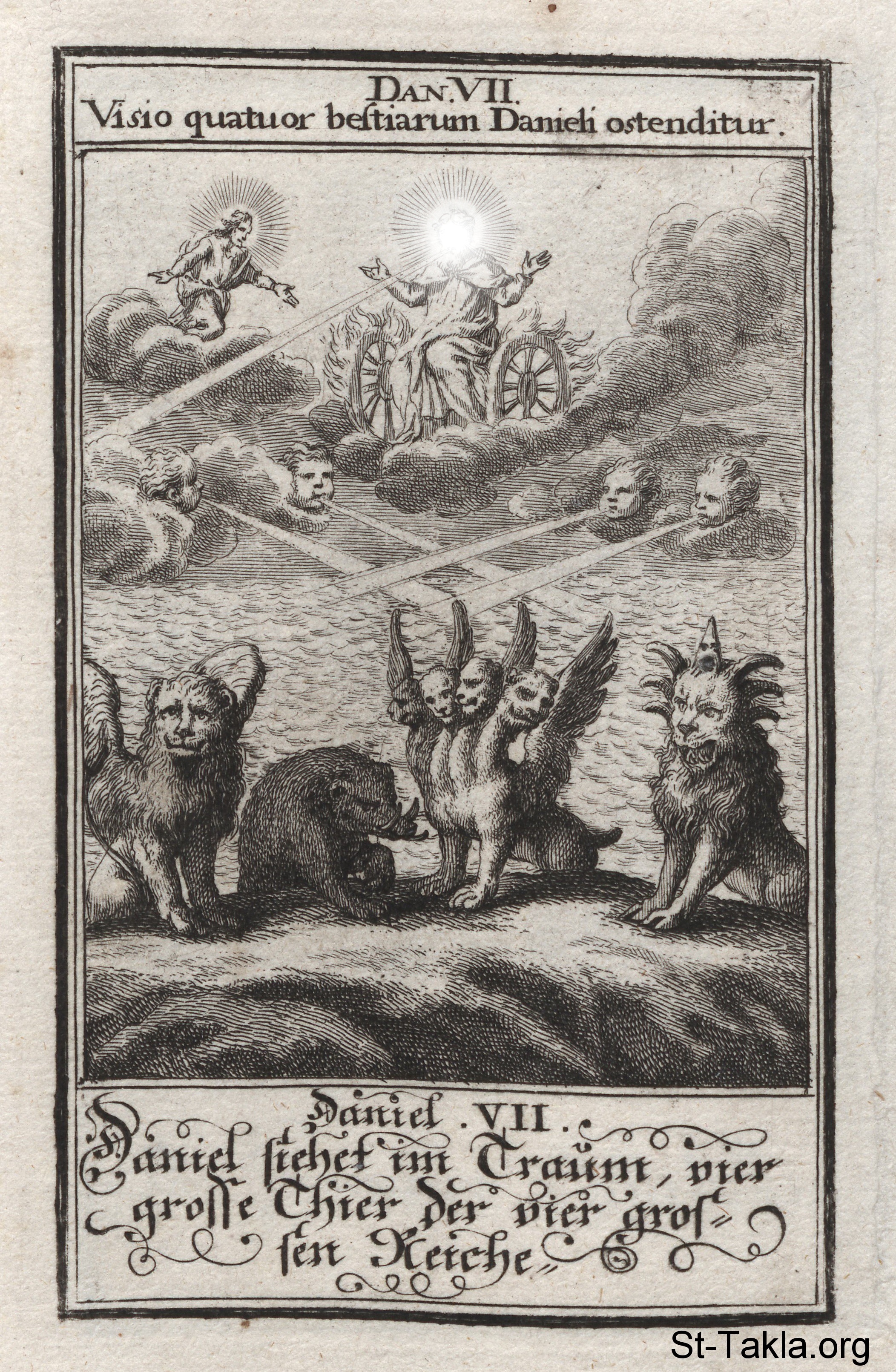 Vision of Four Beasts: As the four winds blow upon the waters, out of the sea emerge four beasts: one with the head of a lion and wings of the eagle; a second was in the form of a bear and had three ribs in its mouth; the third beast had four heads and four wings; and the fourth beast had long teeth, multiple horns, and hooves like those of an ox. The Ancient One is enthroned on the clouds at the top: (Daniel 7) - from the book: Biblia Ectypa (Pictorial Bible), by Johann Christoph Weigel, 1695.