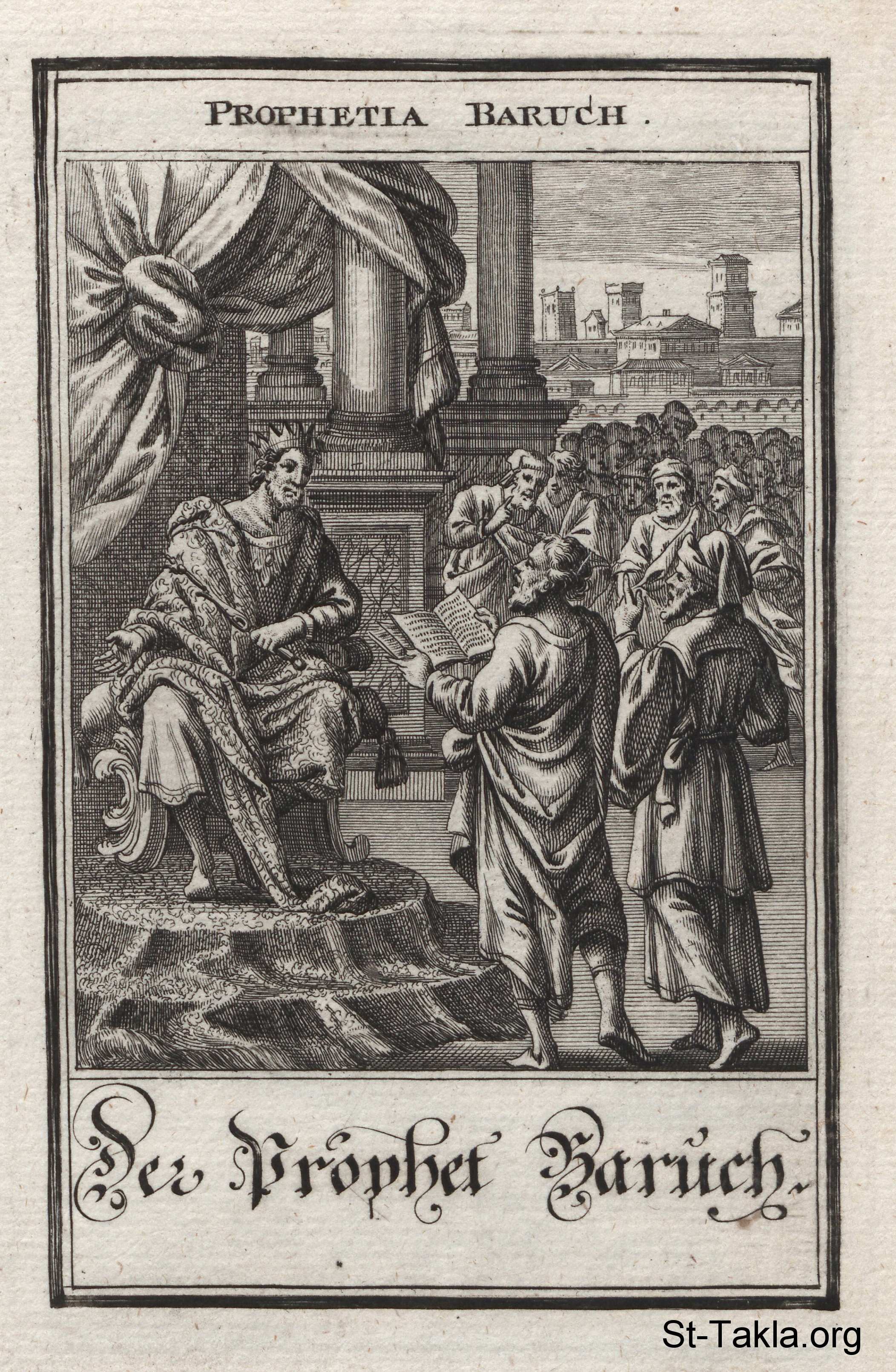 Prophet Baruch: The prophet Baruch reads the words of his prophecy to King Jeconiah of Judah - from the book: Biblia Ectypa (Pictorial Bible), by Johann Christoph Weigel, 1695.