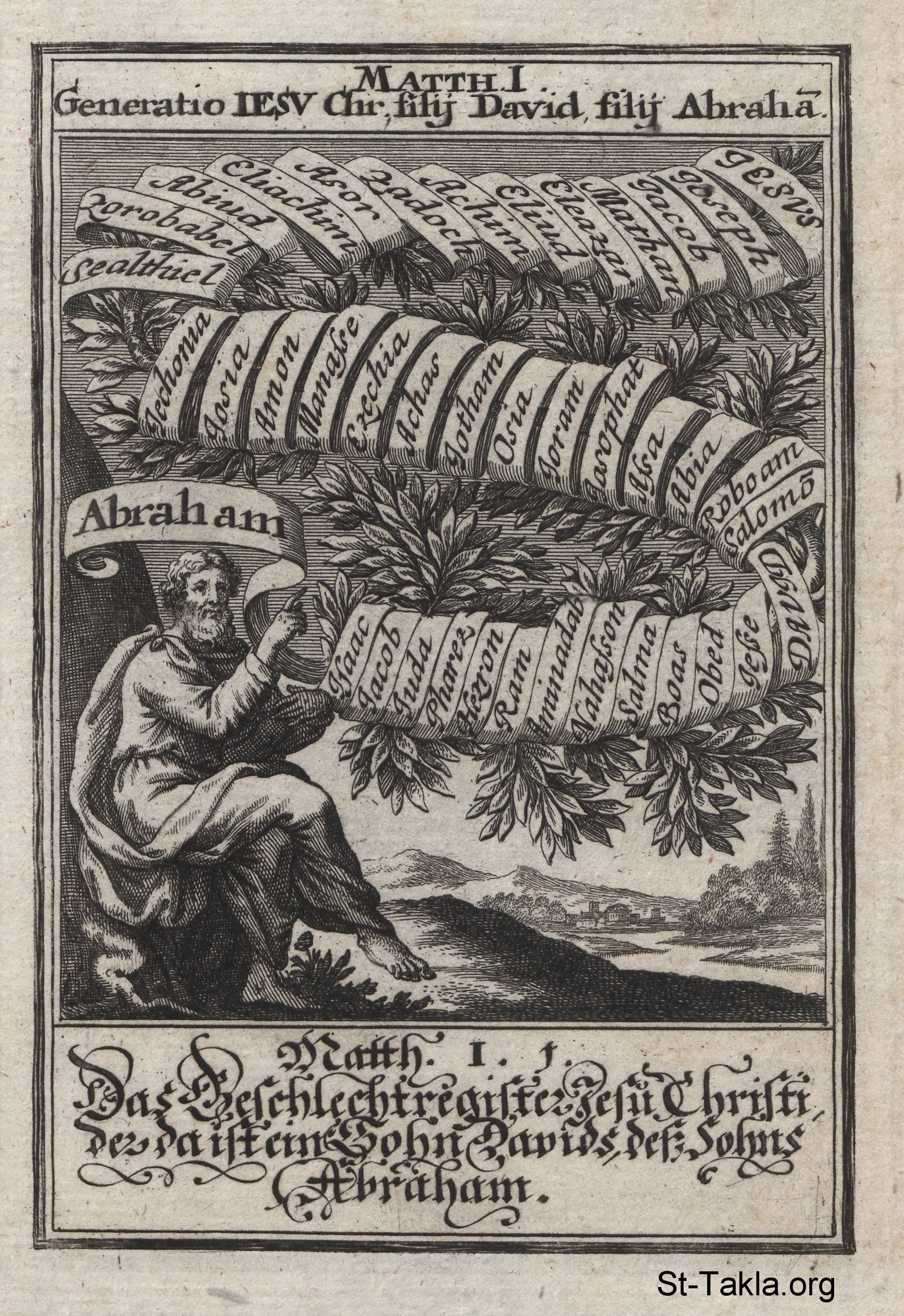 أنساب السيد المسيح من إبراهيم: (متى 1) - من كتاب: تاريخ السيد المسيح، يوهان كريستوف فيجيل، 1695 م.