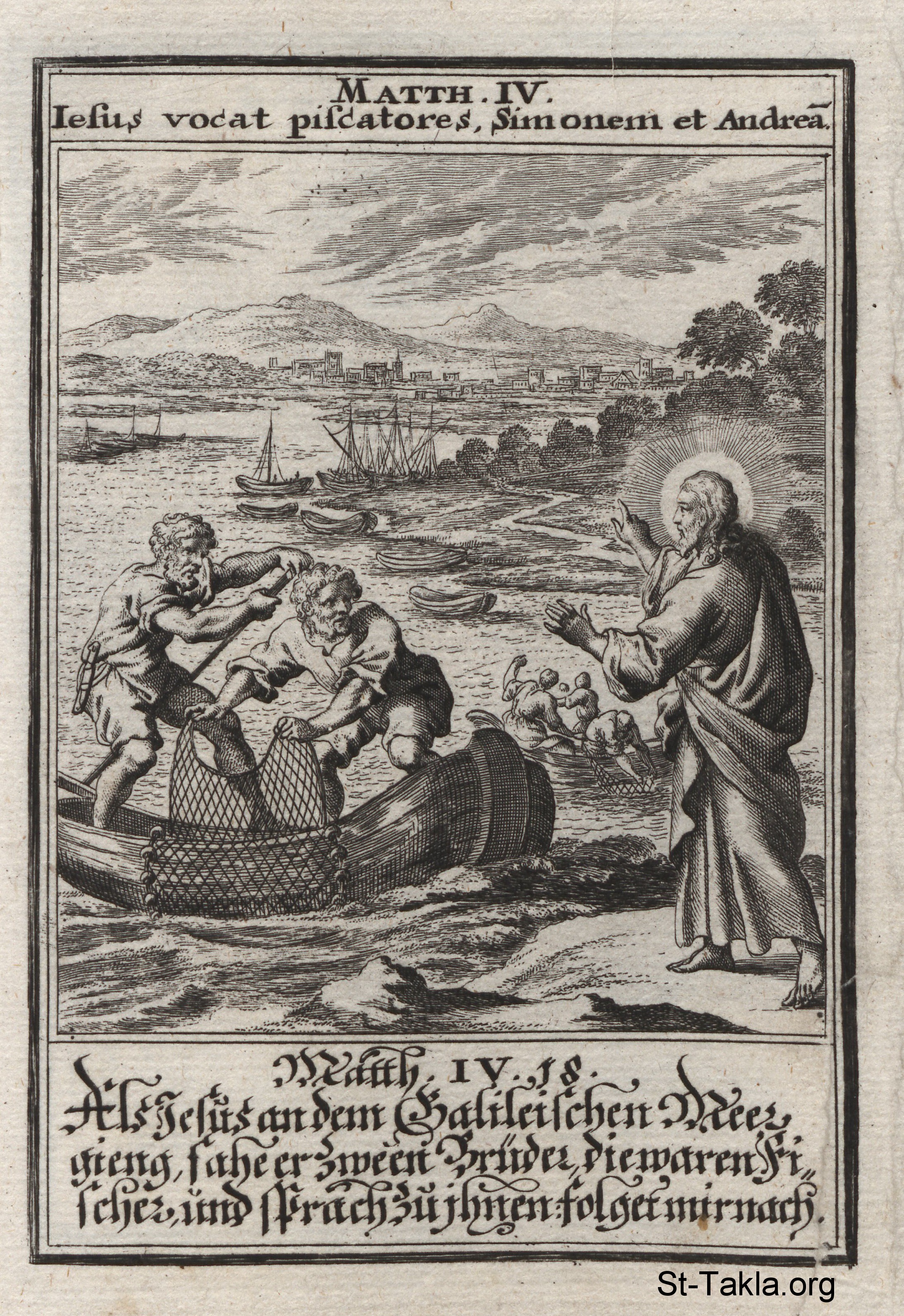 دعوة التلاميذ: السيد المسيح يدعو سمعان بطرس وأندراوس على بحر الجليل وهما يصطادان: (متى 4) - من كتاب: تاريخ السيد المسيح، يوهان كريستوف فيجيل، 1695 م.