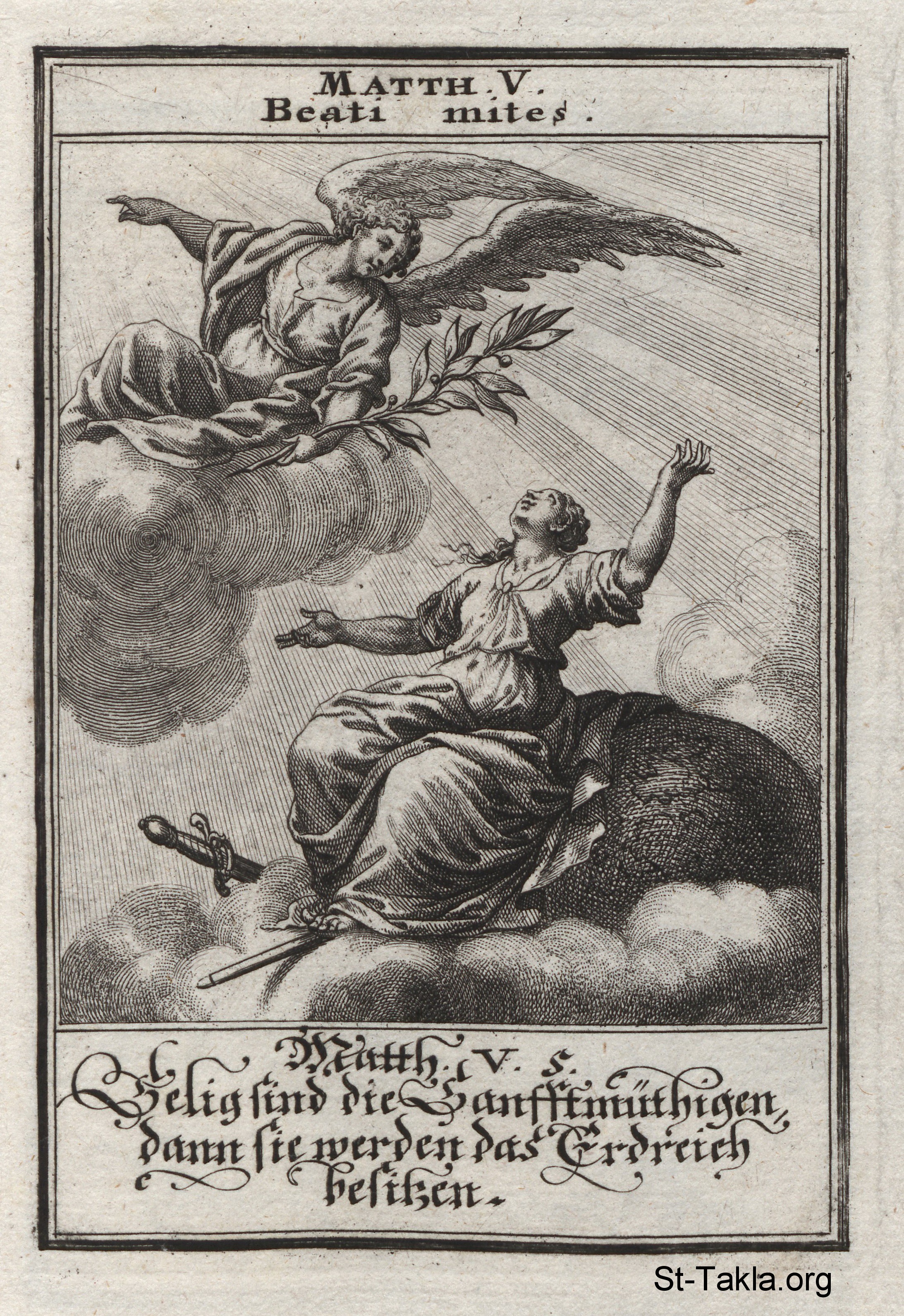 "طوبى للودعاء، لأنهم يرثون الأرض": ثالث التطويبات (متى 5: 5) - من كتاب: تاريخ السيد المسيح، يوهان كريستوف فيجيل، 1695 م.