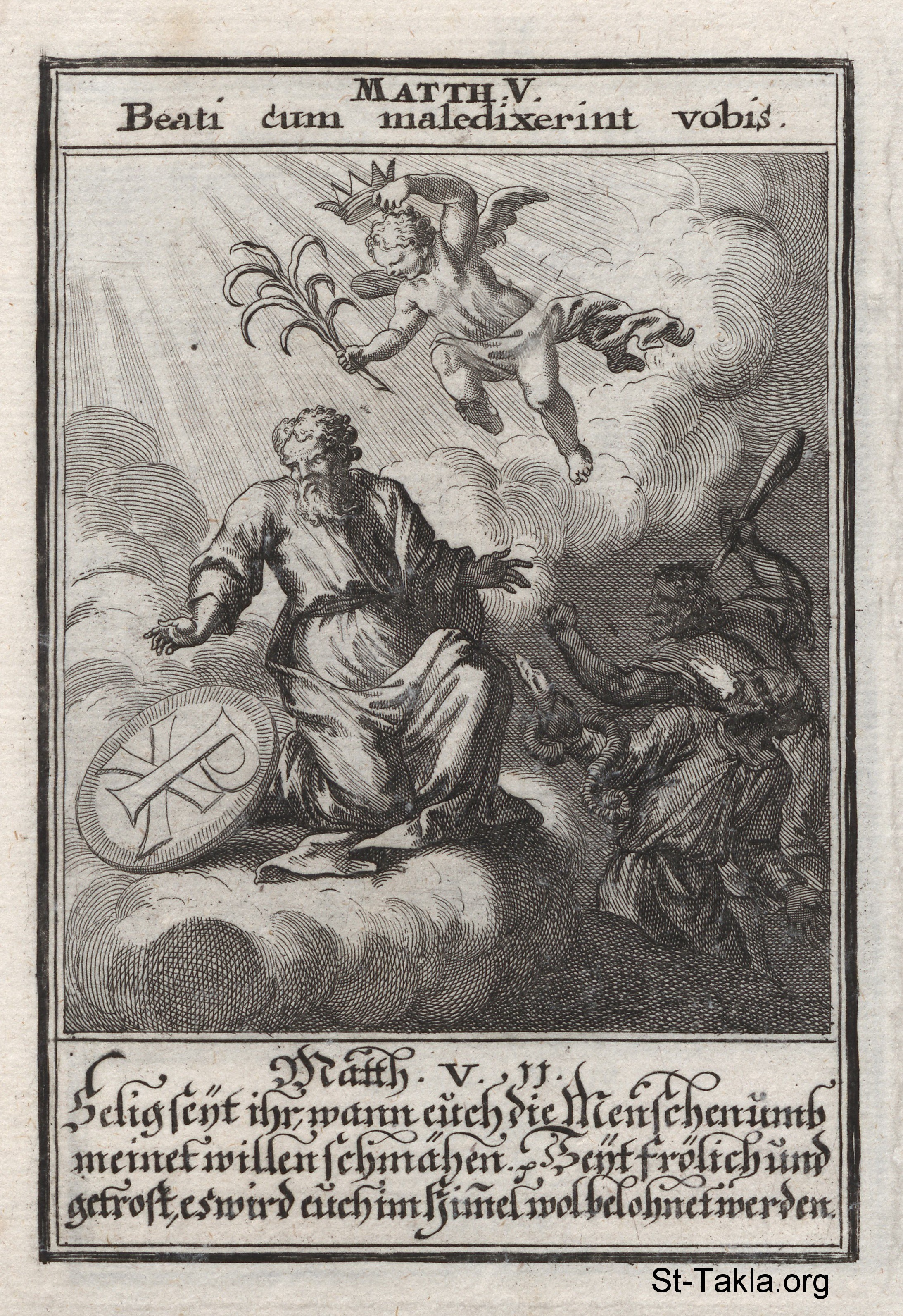 طوبى للمهان والمضطهدين: عندما يتعرض الإنسان للاضطهاد، يقدم له الكروب تاجا كتجسيد للتطويبة النهائية: "طوبى لكم إذا عيروكم وطردوكم وقالوا عليكم كل كلمة شريرة، من أجلي، كاذبين." (مت 5: 11). - من كتاب: تاريخ السيد المسيح، يوهان كريستوف فيجيل، 1695 م.