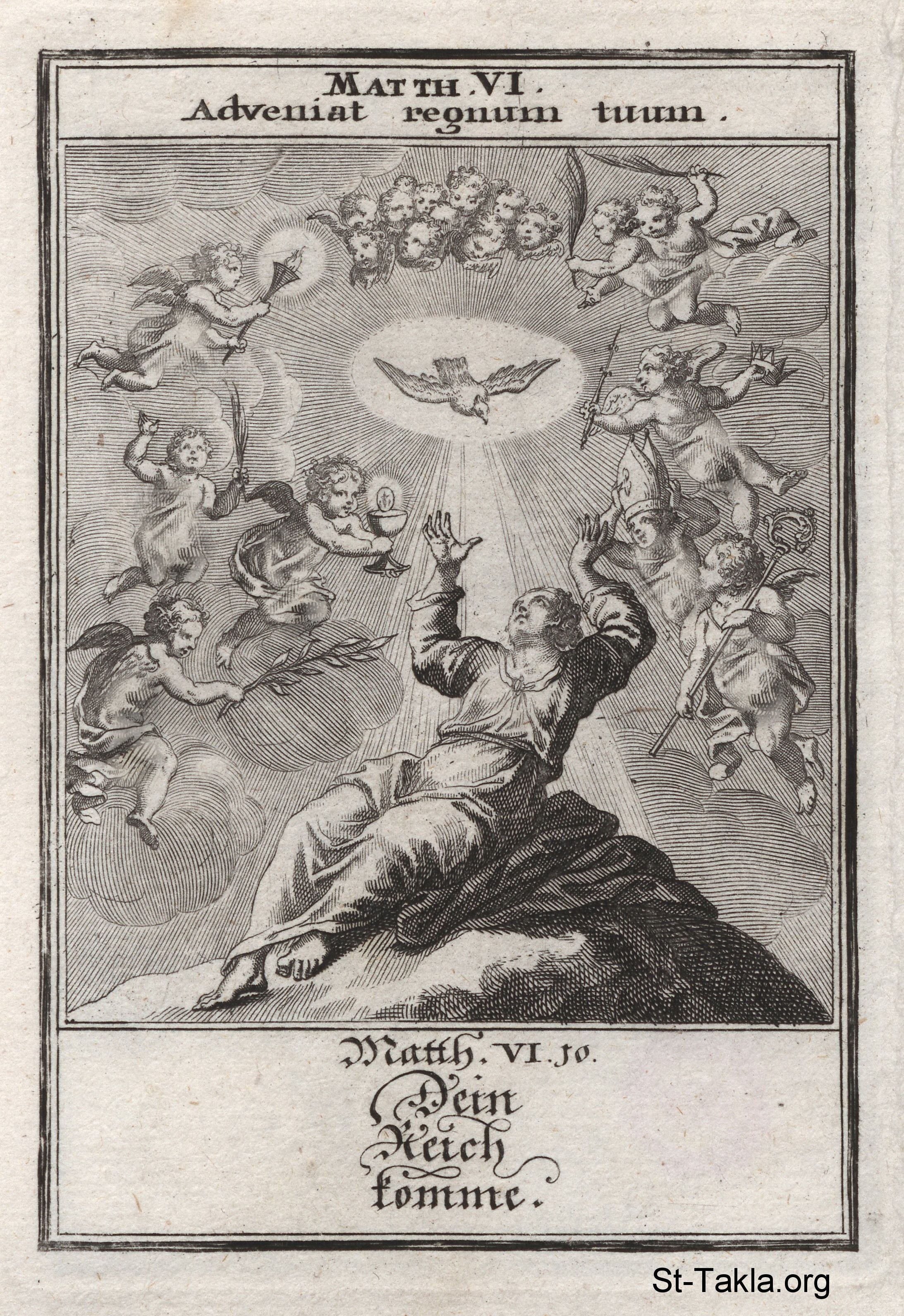 الصلاة الربانية: "ليأت ملكوتك": الروح القدس نازلًا على شخص يصلي ورافع يديه للسماء، والشروبيم يحملون رموز متعددة للسيد المسيح (متى 6: 10) - من كتاب: تاريخ السيد المسيح، يوهان كريستوف فيجيل، 1695 م.