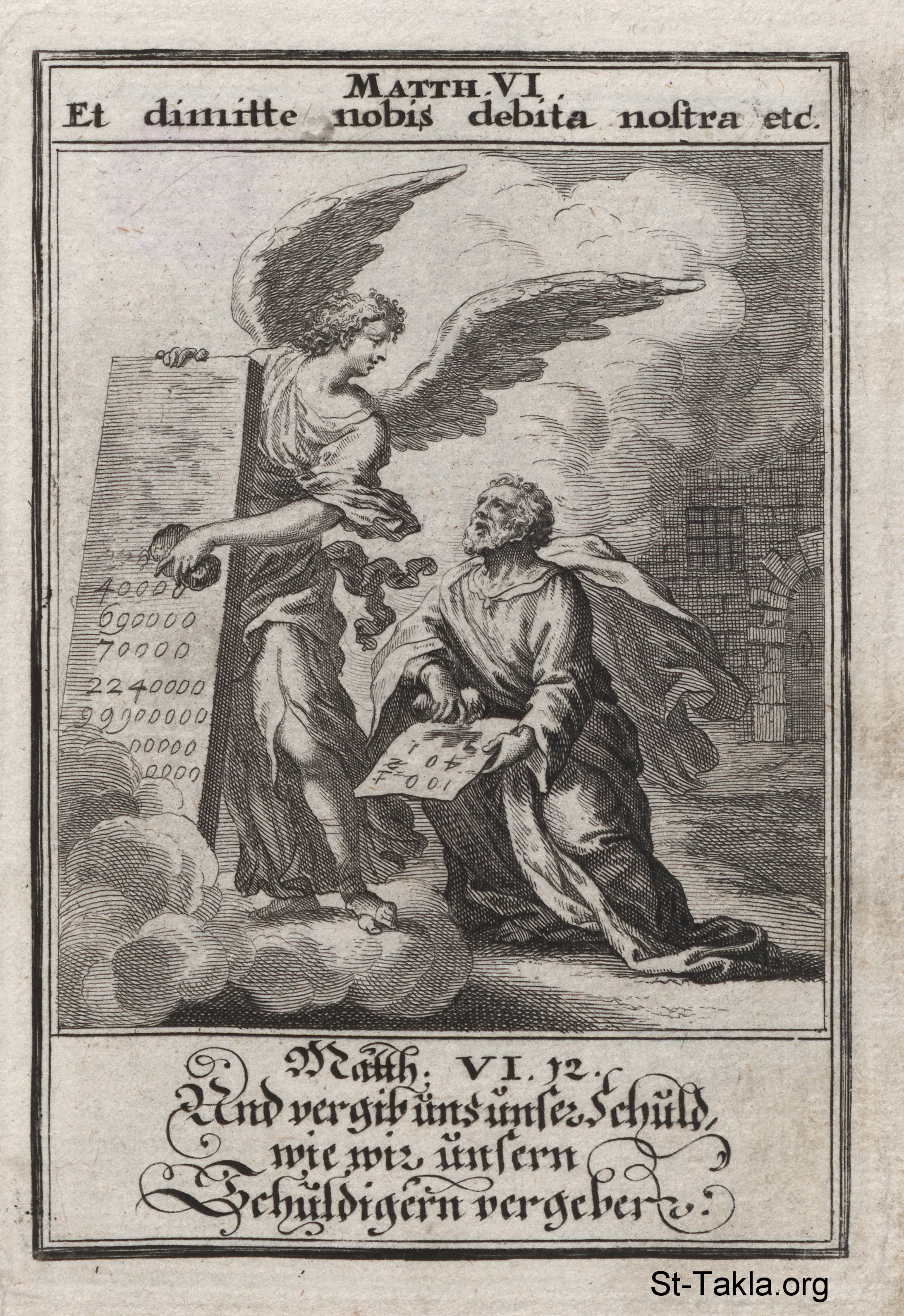 الصلاة الربانية: "واغفر لنا ذنوبنا كما نغفر نحن أيضا للمذنبين إلينا": رمز ملاك يمسح خطايا أحد التائبين (متى 6: 12) - من كتاب: تاريخ السيد المسيح، يوهان كريستوف فيجيل، 1695 م.