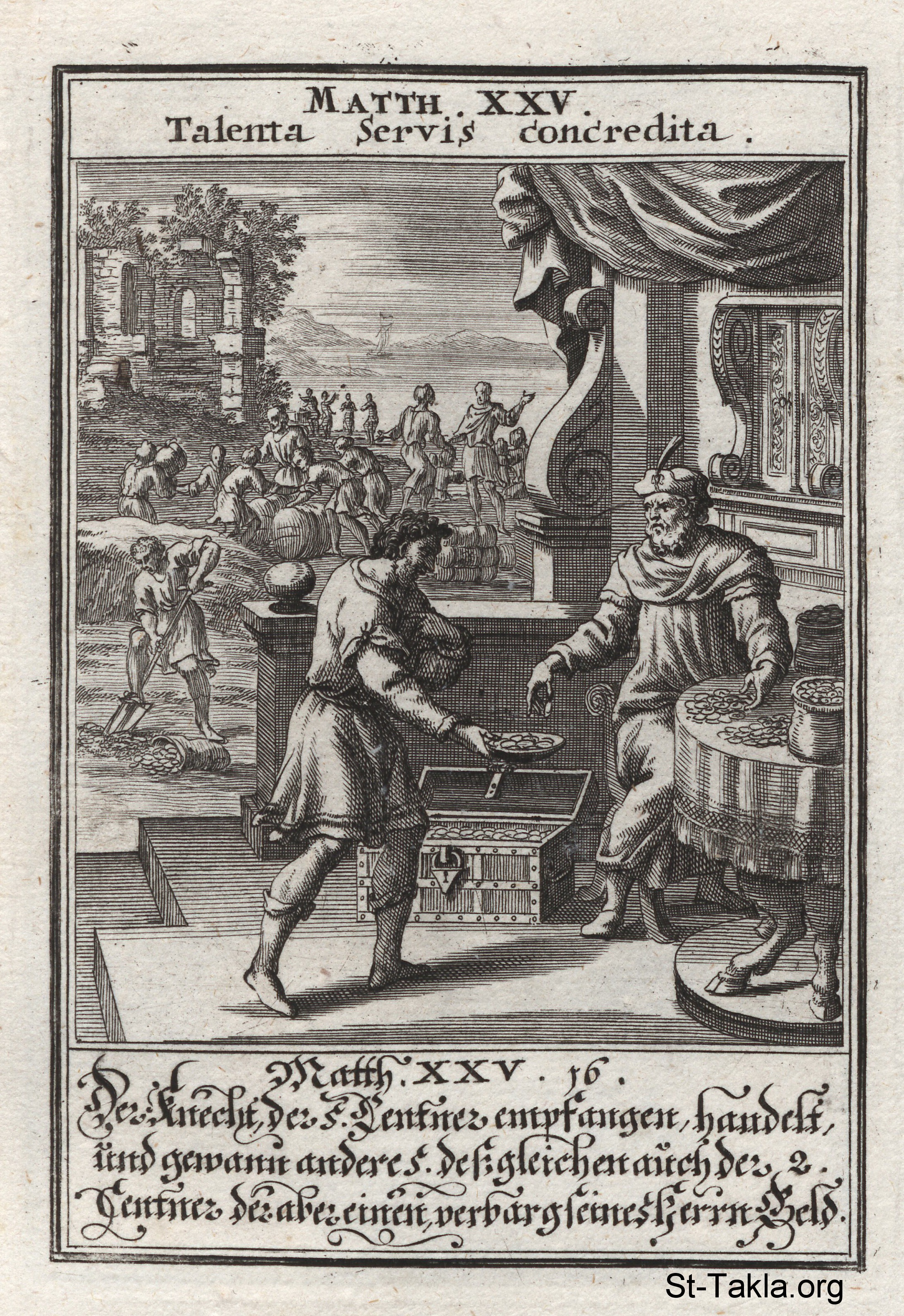 مثل الوزنات: العبيدة الثلاثة يعودون بوزنات سيدهم، ولكن بينما يربح أول اثنين بعد المتاجرة بالوزنات، يحفر الثالث في الأرض ويخفي فضة سيده: (متى 25) - من كتاب: تاريخ السيد المسيح، يوهان كريستوف فيجيل، 1695 م.