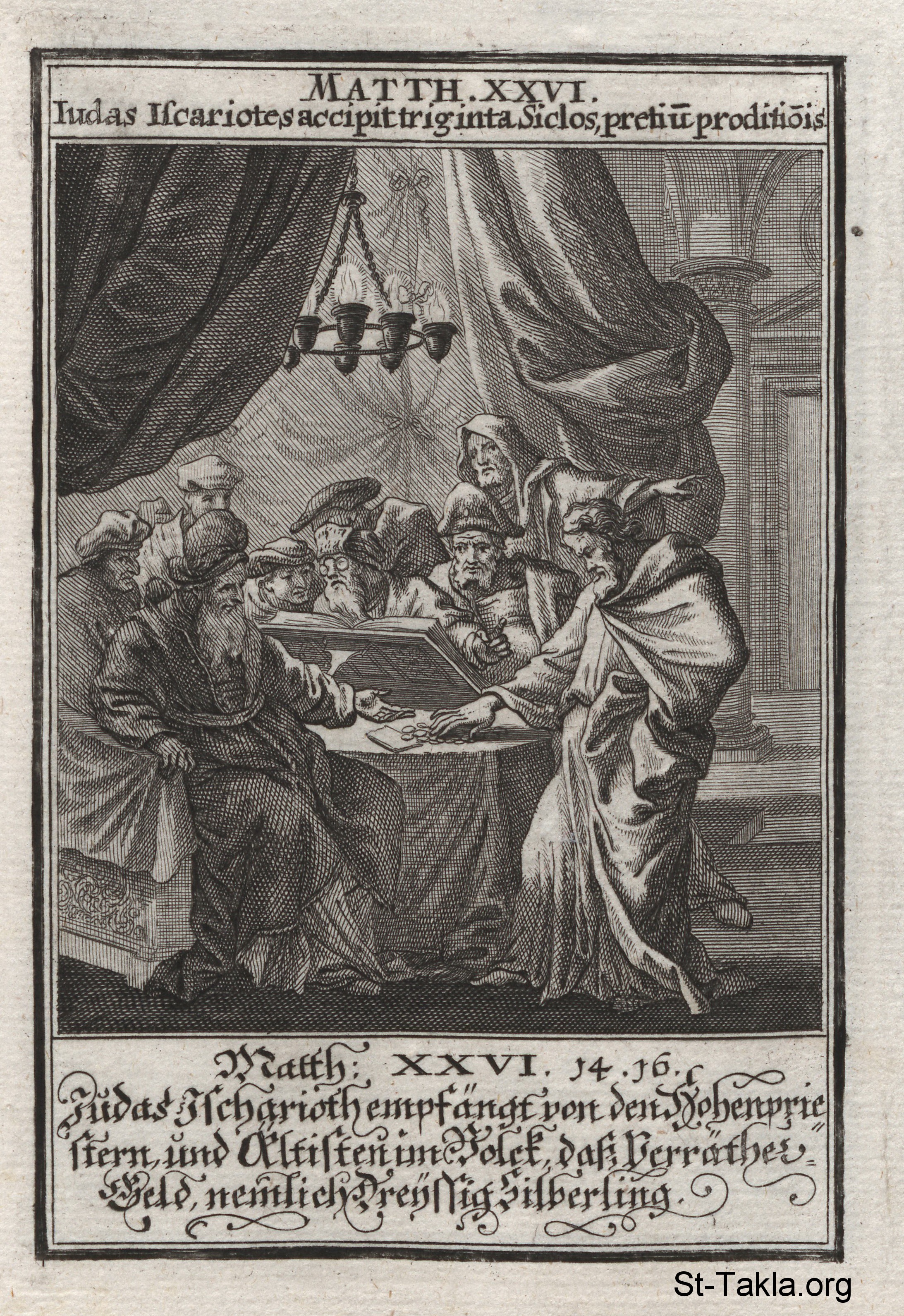 يهوذا الأسخريوطي يوافق على خيانة السيد المسيح مقابل ثلاثين من الفضة: (متى 26) - من كتاب: تاريخ السيد المسيح، يوهان كريستوف فيجيل، 1695 م.