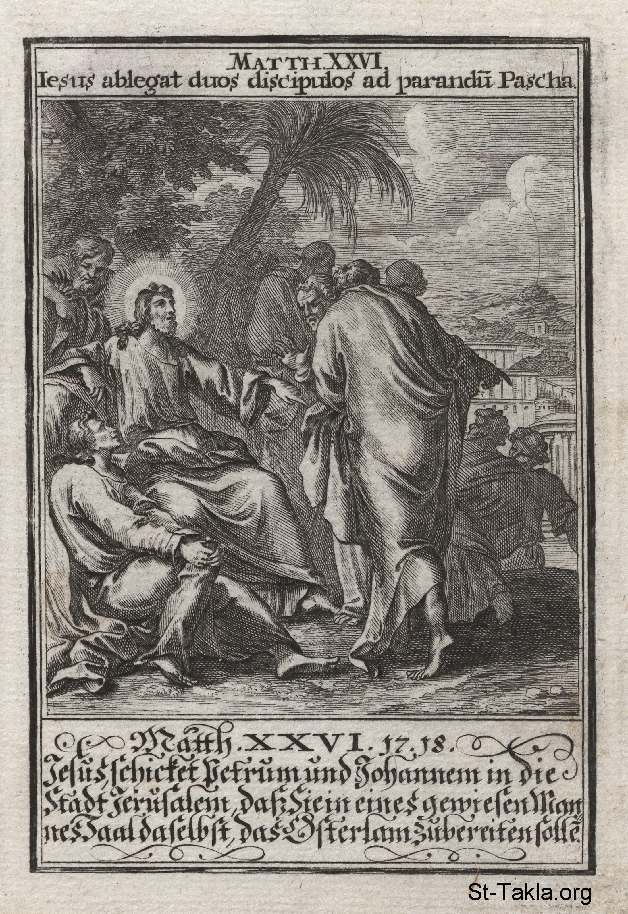 تعليمات تجهيز عشاء الفصح: التلاميذ يسألون السيد المسيح عن مكان الإعداد للفصح: (متى 26: 17-18) - من كتاب: تاريخ السيد المسيح، يوهان كريستوف فيجيل، 1695 م.