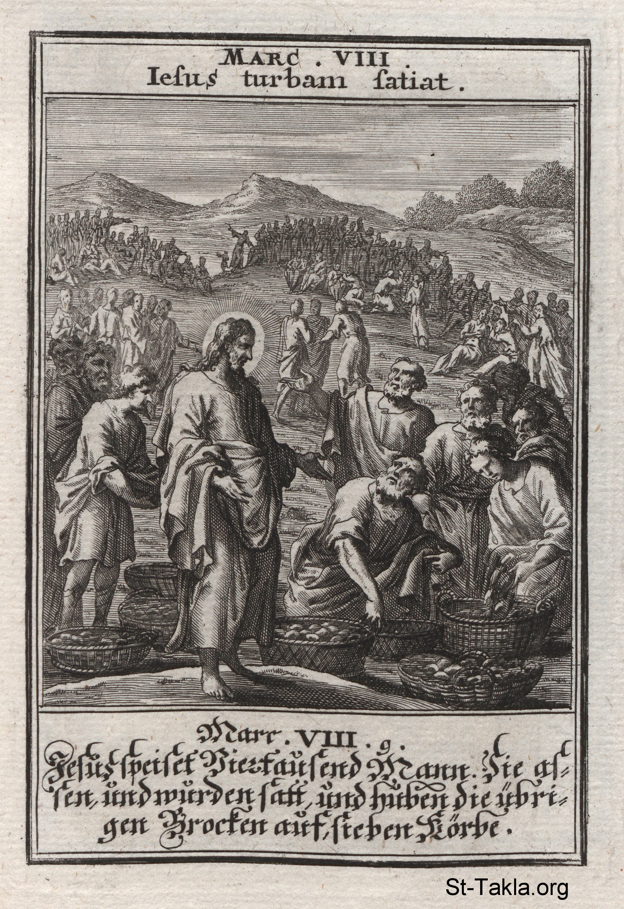 معجزة إشباع الأربعة آلاف: إشباع الجموع بواسطة السيد المسيح من خلال سبعة أرغفة وقليل من السمك، وامتلاء سبعة قفف من الكسر: (مرقس 8) - من كتاب: تاريخ السيد المسيح، يوهان كريستوف فيجيل، 1695 م.