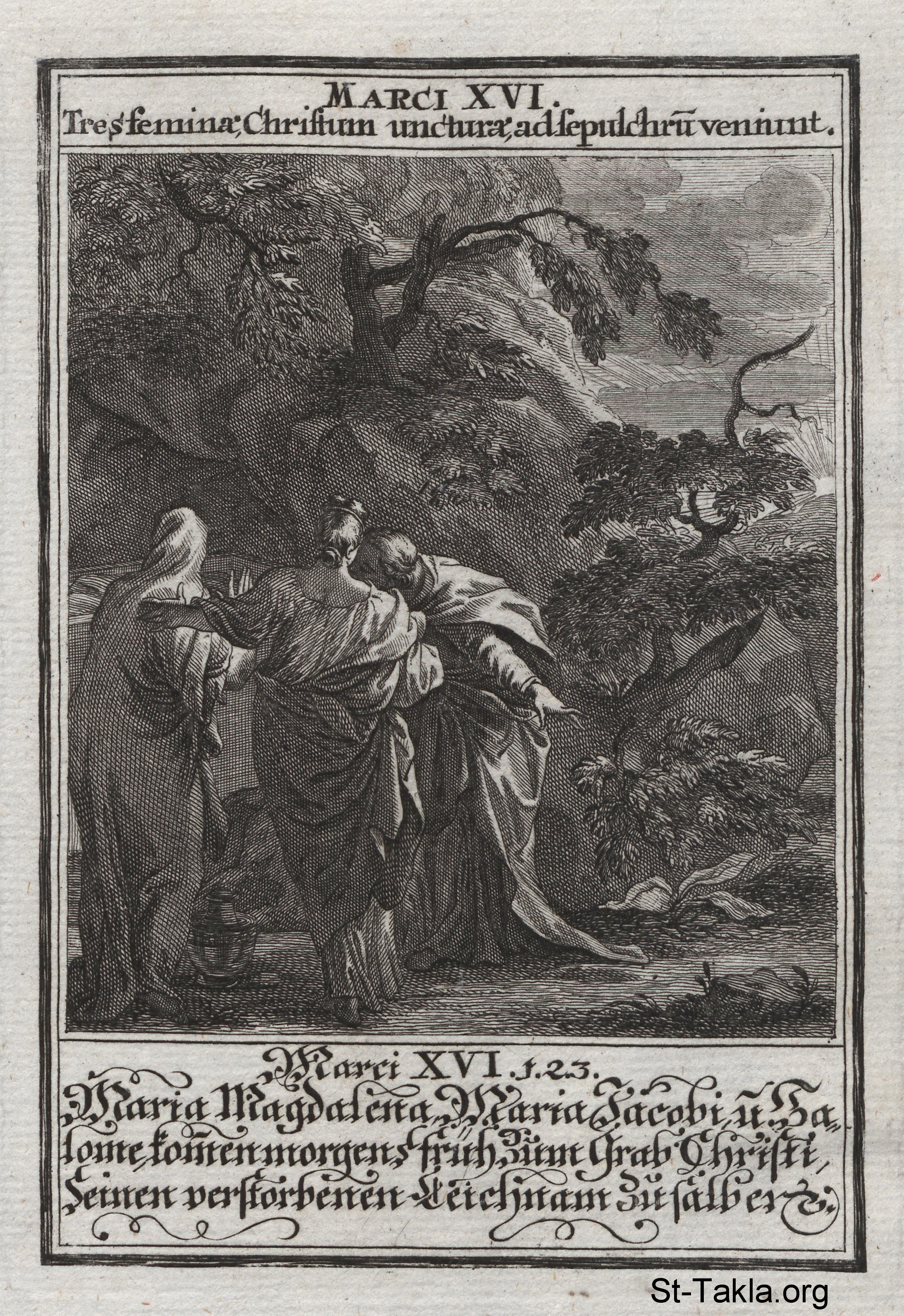 القبر الفارغ: النسوة يأتين إلى قبر يسوع: (مرقس 16) - من كتاب: تاريخ السيد المسيح، يوهان كريستوف فيجيل، 1695 م.