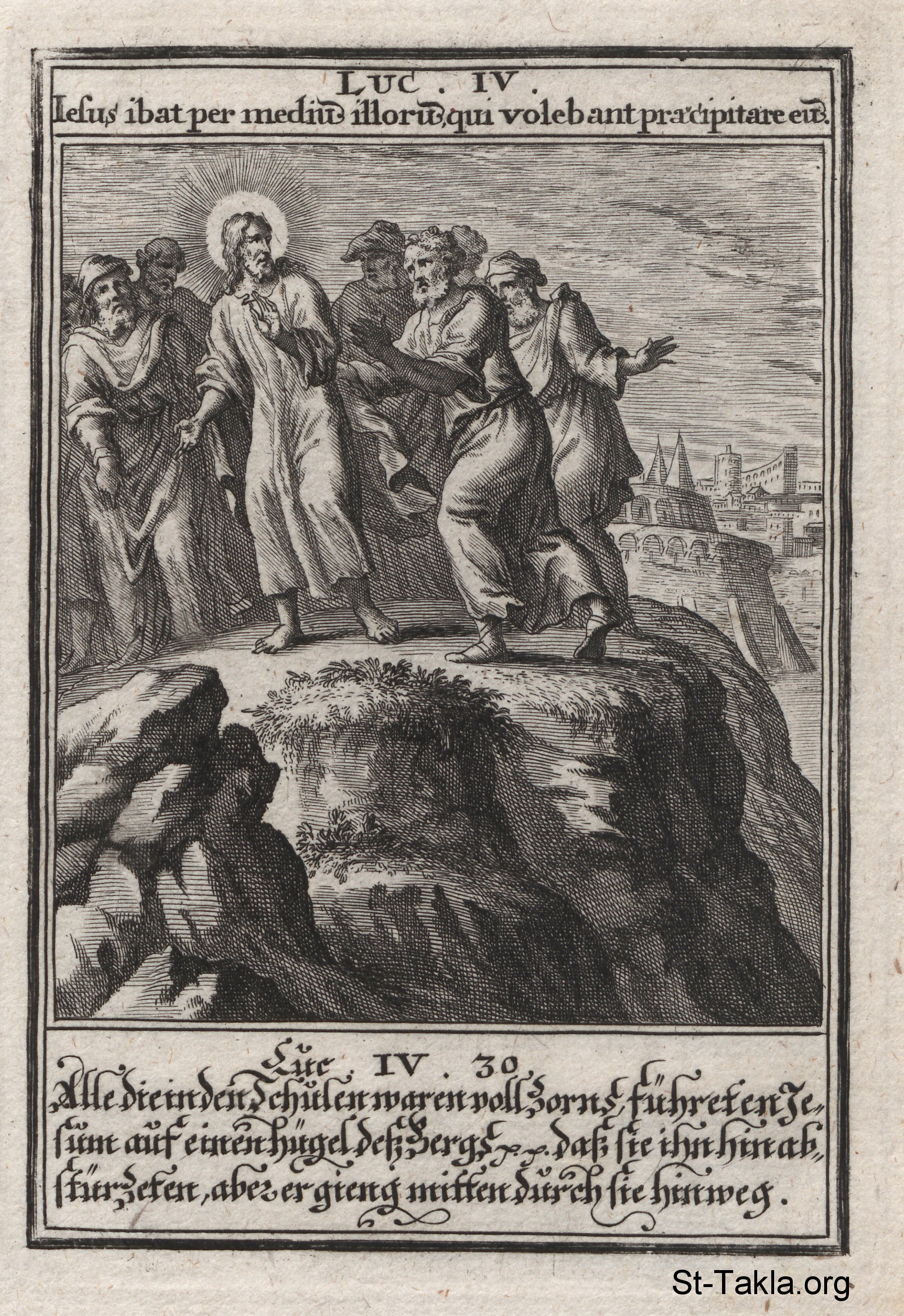 يسوع في الناصرة: أهل السامرة يحاولون إلقاء السيد المسيح من فوق حافة جبل: (لوقا 4: 29) - من كتاب: تاريخ السيد المسيح، يوهان كريستوف فيجيل، 1695 م.