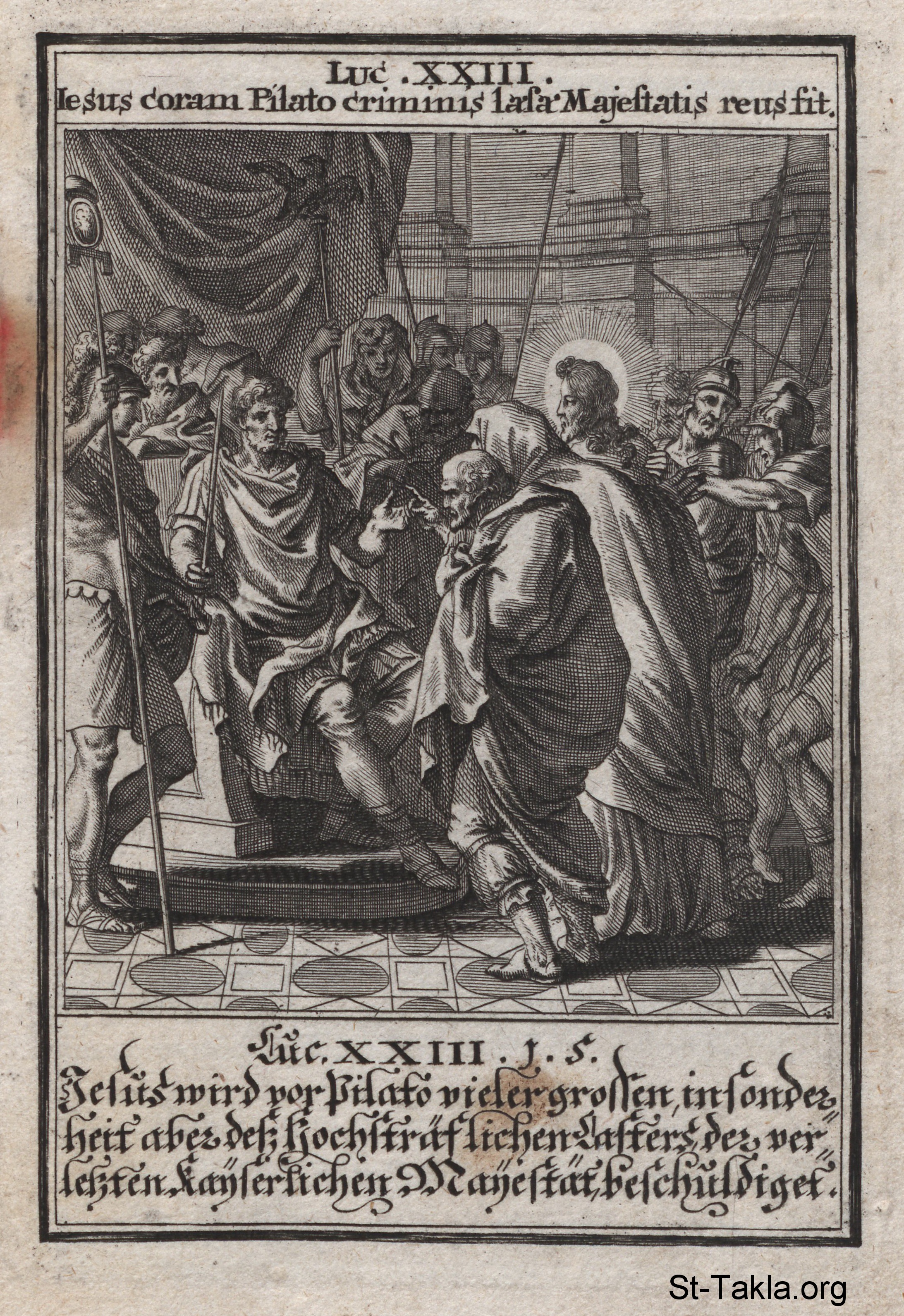 الرب يسوع أمام بيلاطس: محاكمة السيد المسيح أمام بيلاطس: (لوقا 23) - من كتاب: تاريخ السيد المسيح، يوهان كريستوف فيجيل، 1695 م.