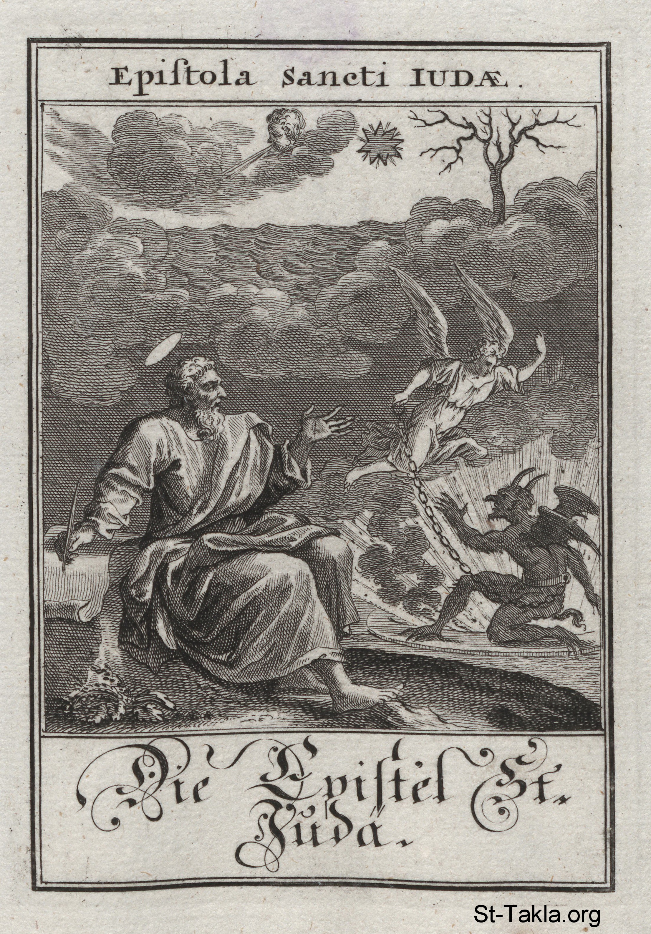 رسالة يهوذا: يهوذا يكتب رسالته بينما يظهر الملاك ميخائيل رئيس الملائكة يحارب الشيطان (يهوذا 1: 9)، مع صور "غيوم بلا ماء تحملها الرياح. أشجار خريفية بلا ثمر ميتة مضاعفا، مقتلعة" (يهوذا 1: 12) - من كتاب: قصة الآباء الرسل والرسائل، يوهان كريستوف فيجيل، 1695 م.