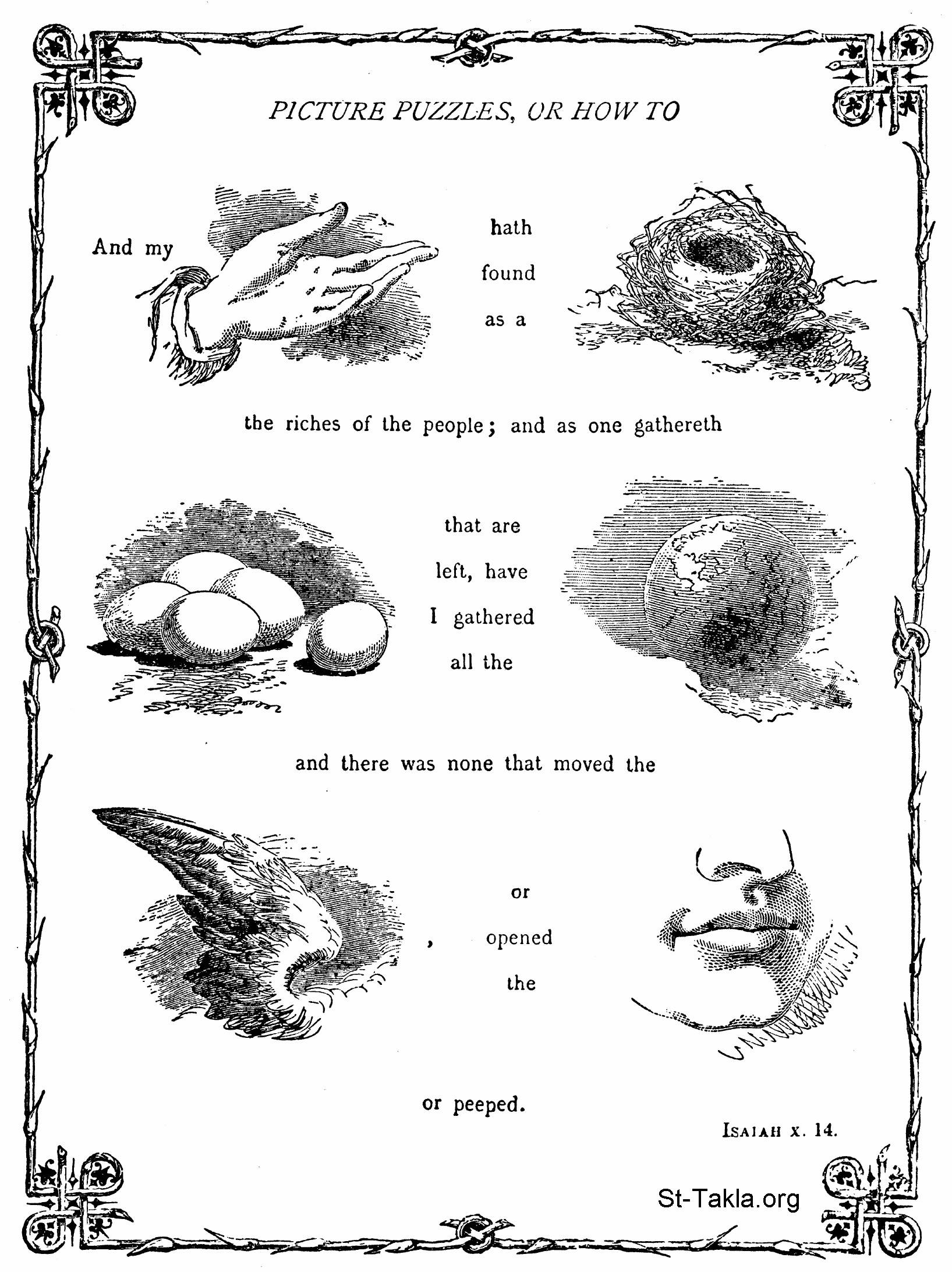 "And my hand hath found as a nest the riches of the people: and as one gathereth eggs that are left, have I gathered all the earth; and there was none that moved the wing, or opened the mouth, or peeped". (Isaiah 10:14) - from the book: Picture puzzles, or, How to read the Bible by symbols, by Beard, Frank, 1899.