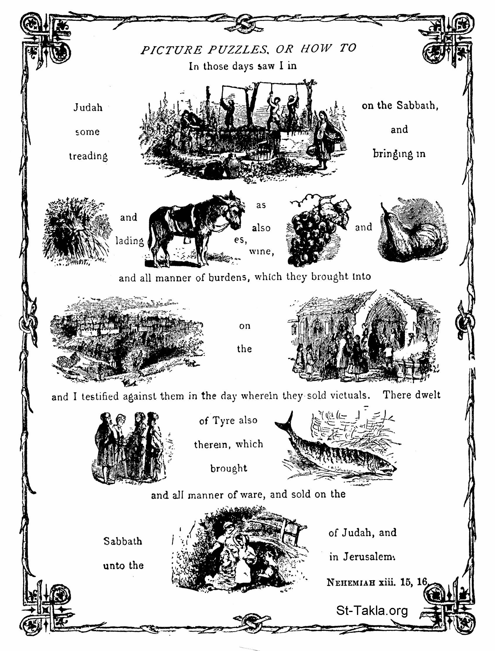 "في تلك الأيام رأيت في يهوذا قوما يدوسون معاصر في السبت، ويأتون بحزم ويحملون حميرا، وأيضا يدخلون أورشليم في يوم السبت بخمر وعنب وتين وكل ما يحمل، فأشهدت عليهم يوم بيعهم الطعام. والصوريون الساكنون بها كانوا يأتون بسمك وكل بضاعة، ويبيعون في السبت لبني يهوذا في أورشليم" (نحميا 13: 15-16) - من كتاب ألغاز مصورة: كيف تقرأ الكتاب المقدس من خلال الرموز، فرانك بيرد، 1899 م.