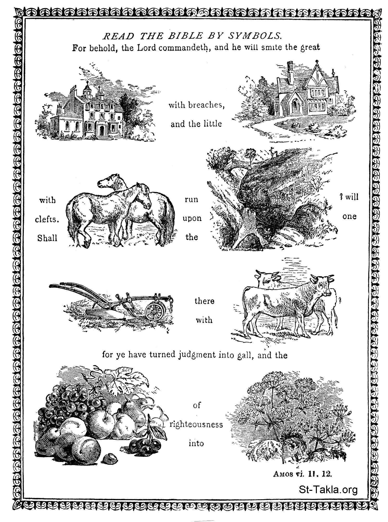"لأنه هوذا الرب يأمر فيضرب البيت الكبير ردما، والبيت الصغير شقوقا. هل تركض الخيل على الصخر؟ أو يحرث عليه بالبقر؟ حتى حولتم الحق سما، وثمر البر أفسنتينا" (عاموس 6: 11-12) - من كتاب ألغاز مصورة: كيف تقرأ الكتاب المقدس من خلال الرموز، فرانك بيرد، 1899 م.