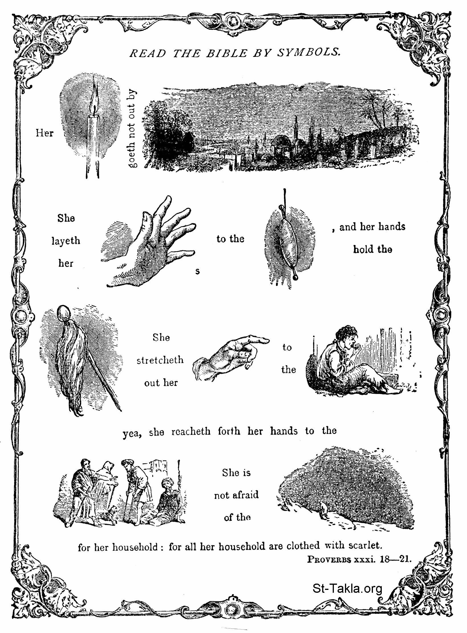 "She perceiveth that her merchandise is good: her candle goeth not out by night. She layeth her hands to the spindle, and her hands hold the distaff. She stretcheth out her hand to the poor; yea, she reacheth forth her hands to the needy. She is not afraid of the snow for her household: for all her household are clothed with scarlet". (Proverbs 31:18-21) - from the book: Picture puzzles, or, How to read the Bible by symbols, by Beard, Frank, 1899.