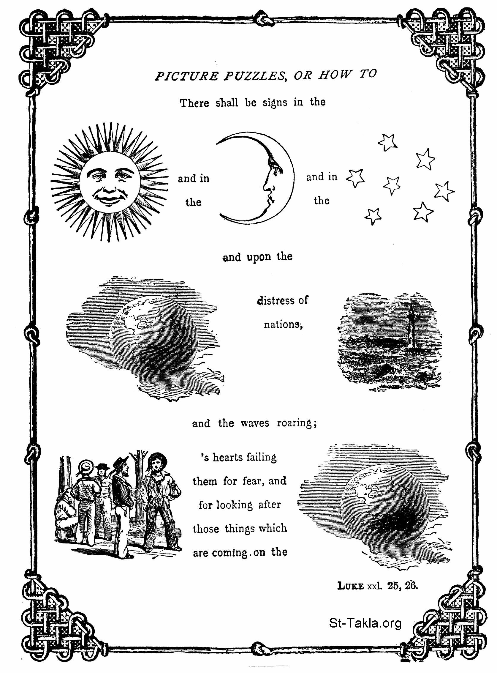 "And there shall be signs in the sun, and in the moon, and in the stars; and upon the earth distress of nations, with perplexity; the sea and the waves roaring; Men's hearts failing them for fear, and for looking after those things which are coming on the earth: for the powers of heaven shall be shaken". (Luke 21:25-26) - from the book: Picture puzzles, or, How to read the Bible by symbols, by Beard, Frank, 1899.