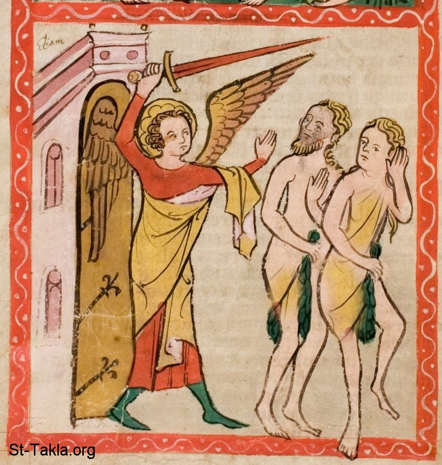 Expulsion of Adam and Eve from Eden, with an angel at the gate - from: Mirror of Human Salvation manuscript (image 8) (Speculum Humanae Salvationis), (Cologne or Westfalia, c1360) - Universitäts-und Landesbibliothek, Darmstadt, Germany, Hs 2505.