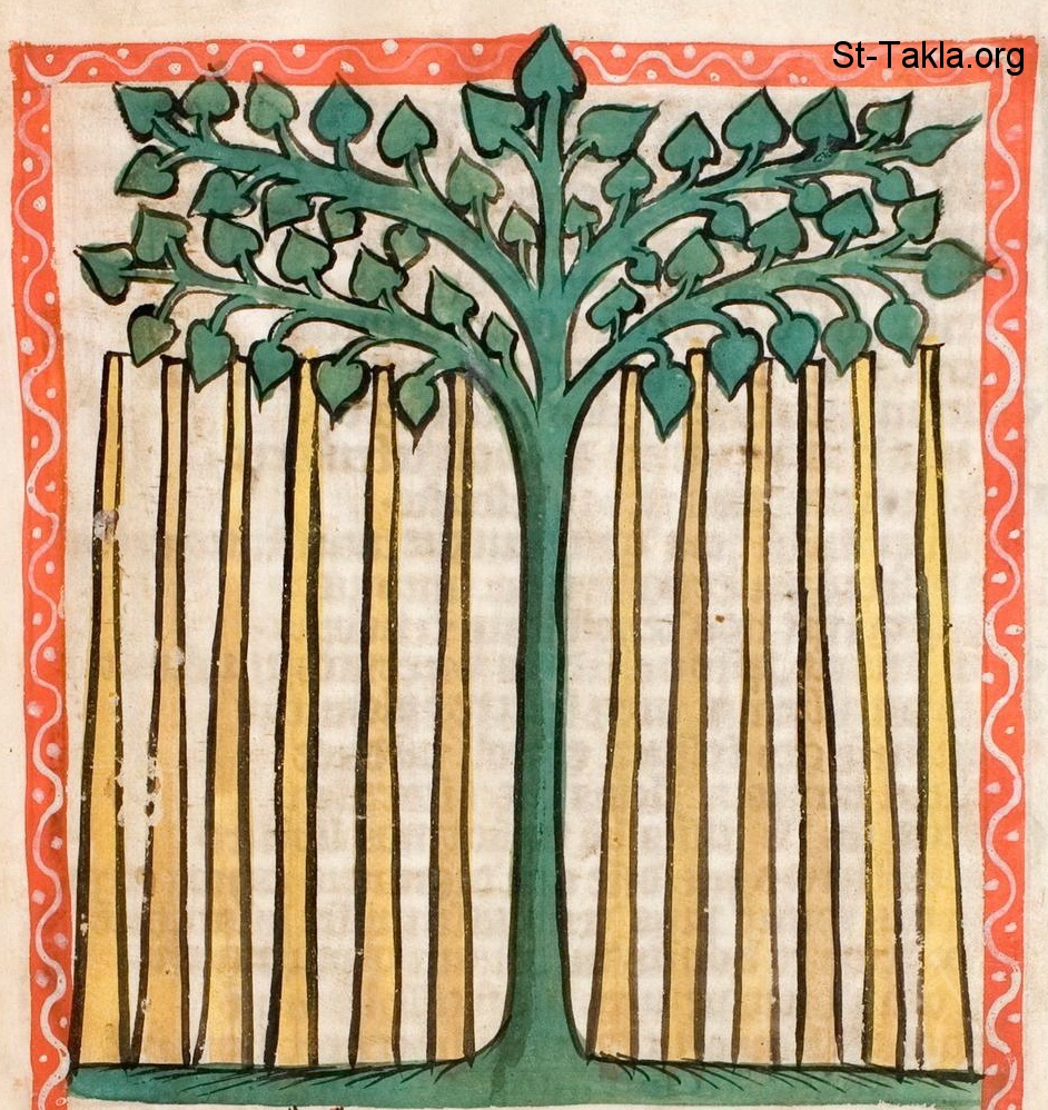 الله يؤكد على مكانة اللاويين (العدد 17-18)، وعصا هارون تفرخ (هارون) (العدد 17: 8-9). - من مخطوط مرآة خلاص البشرية (صورة 46)، صدر في كولونيا أو وستفاليا بألمانيا، 1360 م. تقريبًا - جامعة دارمشتات التقنية، ألمانيا.