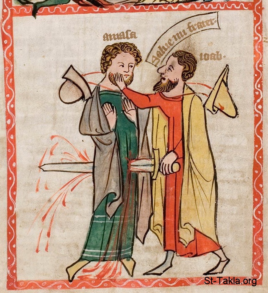 يوآب يقتل عماسا (صموئيل الأول 20: 9-10): يوآب يتظاهر بأنه يريد معانقة عماسا ثم يطعنه. - من مخطوط مرآة خلاص البشرية (صورة 92)، صدر في كولونيا أو وستفاليا بألمانيا، 1360 م. تقريبًا - جامعة دارمشتات التقنية، ألمانيا.