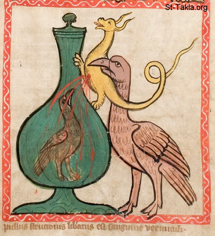 غير كتابي: الملوك الأول: سليمان يحبس فرخ نعامة في إناء زجاجي، والنعامة تخرجه عن طريق وضع دم من دودة في الإناء. - من مخطوط مرآة خلاص البشرية (صورة 155)، صدر في كولونيا أو وستفاليا بألمانيا، 1360 م. تقريبًا - جامعة دارمشتات التقنية، ألمانيا.