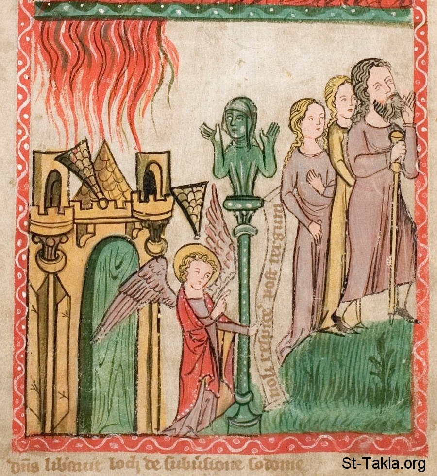 هروب لوط وأسرته من سدوم (التكوين 19: 23، 26): امرأة لوط تتحول إلى عمود ملح (في الوسط)، وإلى اليسار الملاك واقفًا أمام المدينة. - من مخطوط مرآة خلاص البشرية (صورة 173)، صدر في كولونيا أو وستفاليا بألمانيا، 1360 م. تقريبًا - جامعة دارمشتات التقنية، ألمانيا.