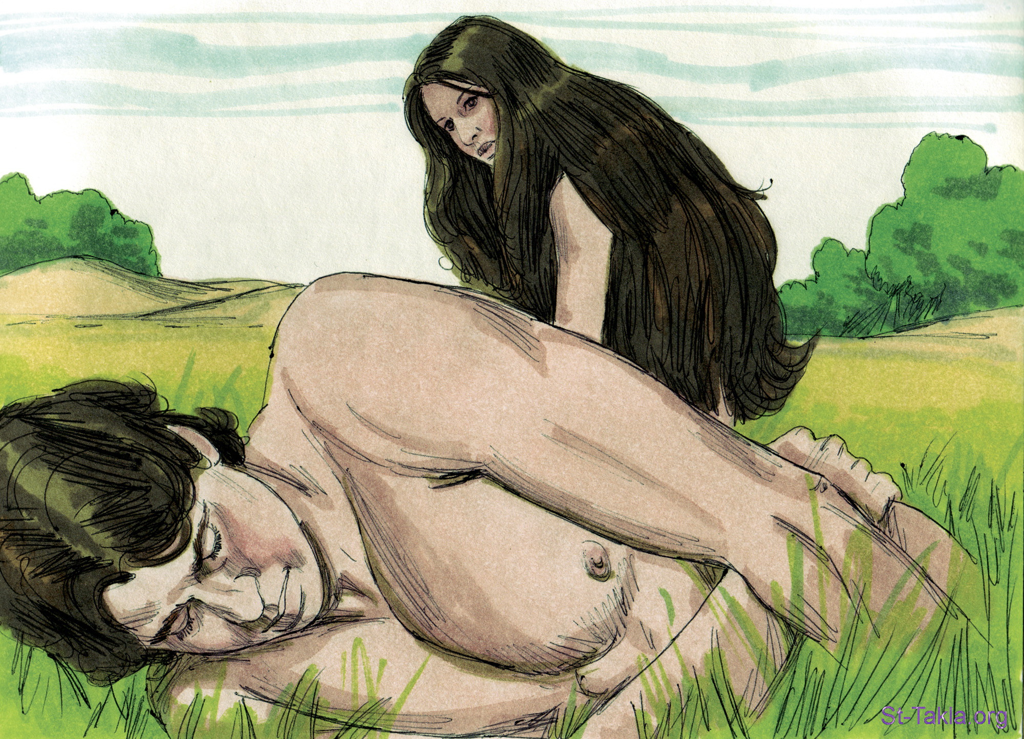 "فأوقع الرب الإله سباتا على آدم فنام، فأخذ واحدة من أضلاعه وملأ مكانها لحما. وبنى الرب الإله الضلع التي أخذها من آدم امرأة وأحضرها إلى آدم" (التكوين 2: 21-22) - مجموعة "الله يخلص السموات والأرض" (التكوين 1-2) - صورة (19) - صور سفر التكوين، رسم جيمز بادجيت (1931-2009)، إصدار شركة سويت ميديا.