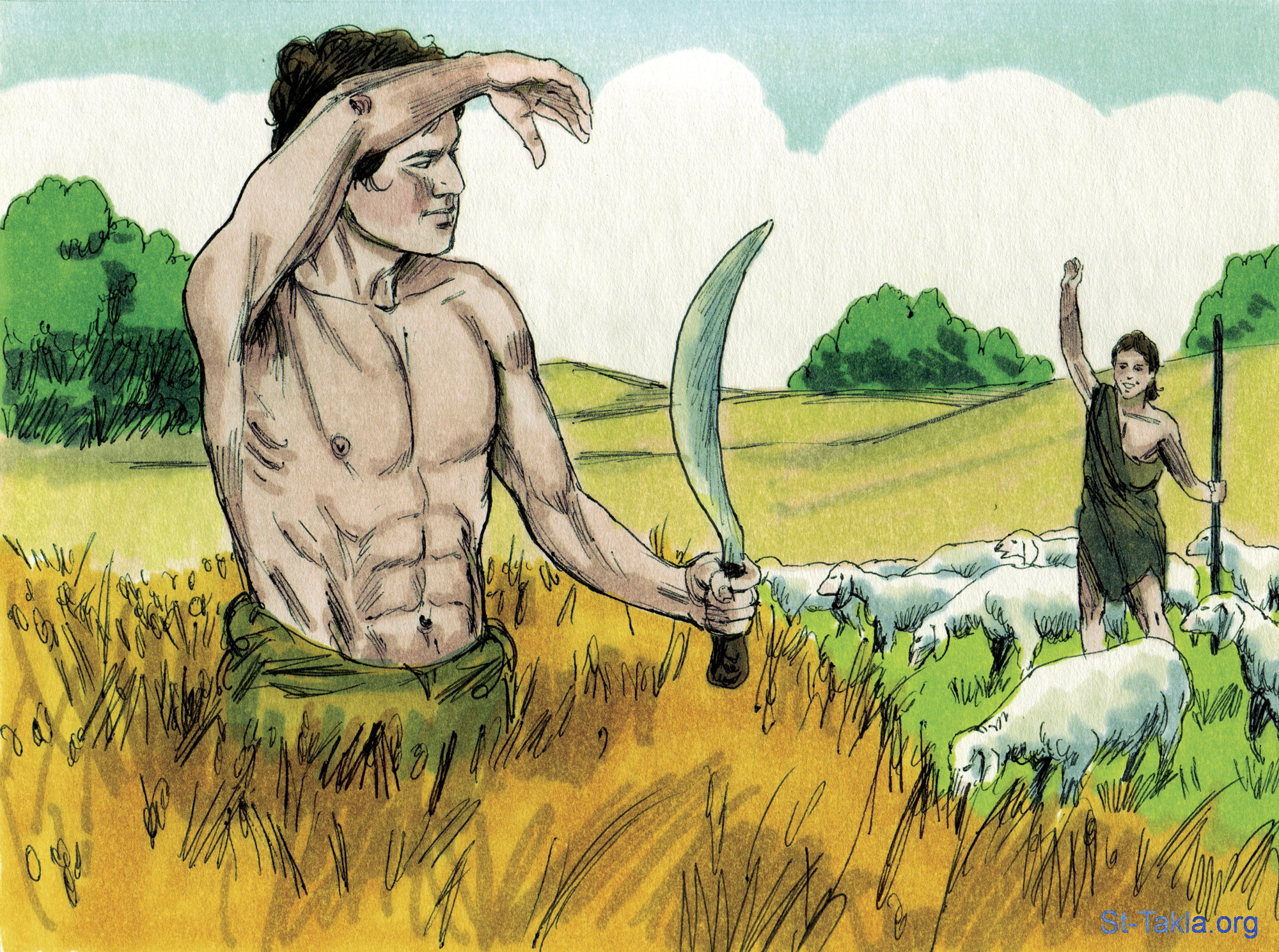 "وكان هابيل راعيا للغنم، وكان قايين عاملا في الأرض" (التكوين 4: 2) - مجموعة "قايين وهابيل" (التكوين 4: 1-15) - صورة (2) - صور سفر التكوين، رسم جيمز بادجيت (1931-2009)، إصدار شركة سويت ميديا.