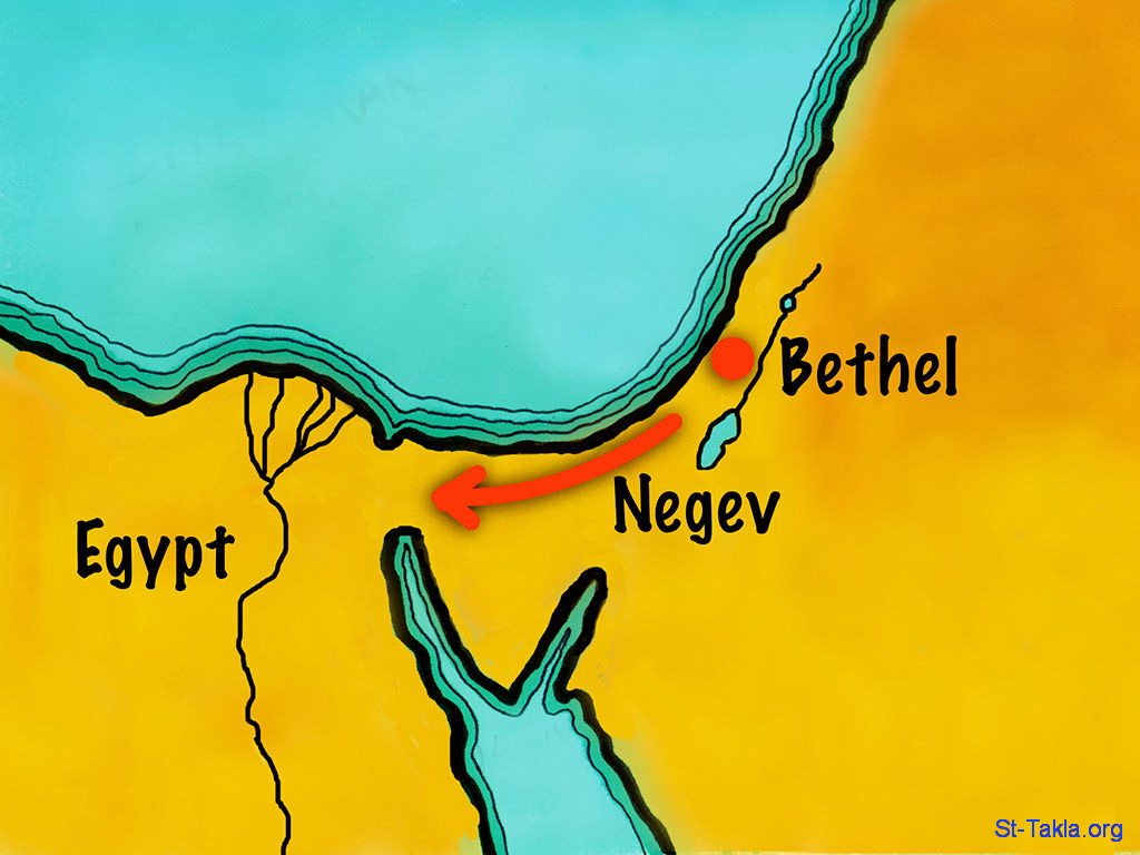 خريطة: "وحدث جوع في الأرض، فانحدر أبرام إلى مصر ليتغرب هناك، لأن الجوع في الأرض كان شديدا" (التكوين 12: 10) - مجموعة "إبرام "إبراهيم" يرتحل إلى كنعان" (التكوين 11: 27 - التكوين 13: 4) - صورة (13) - صور سفر التكوين (1931-2009)، إصدار شركة سويت ميديا.