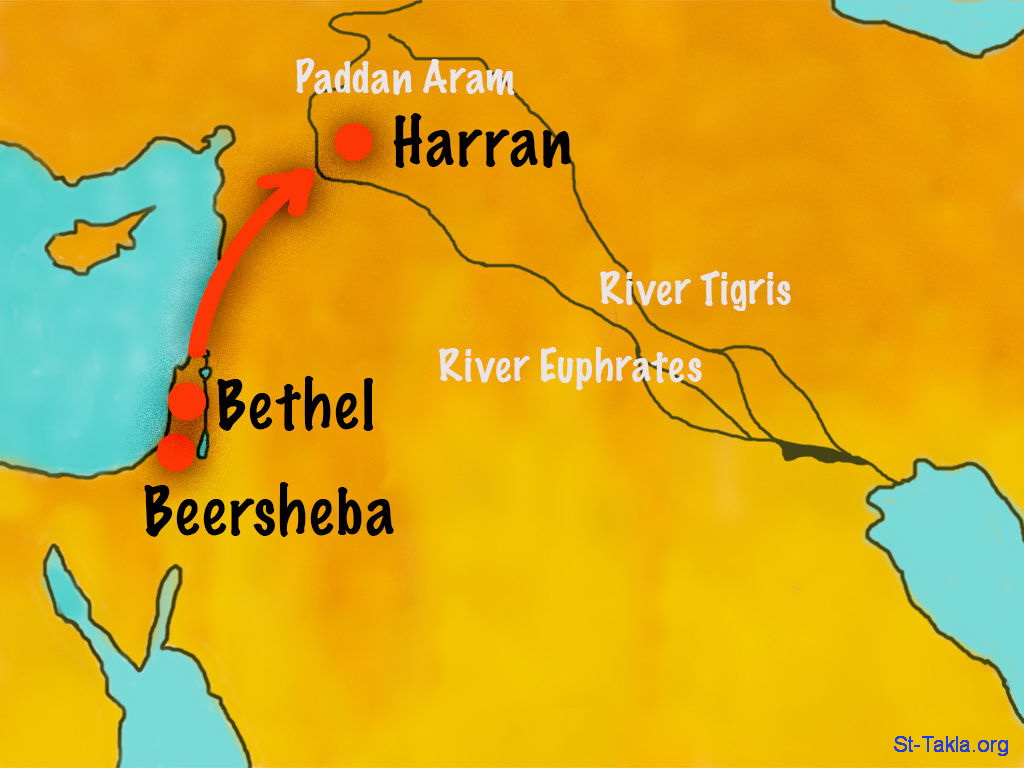 خريطة: فدان أرام: ذهاب يعقوب إلى خاله لابان في حاران - مجموعة "الله يظهر ليعقوب في حلم" (التكوين 28:1-22) - صورة (11) - صور سفر التكوين (1931-2009)، إصدار شركة سويت ميديا.