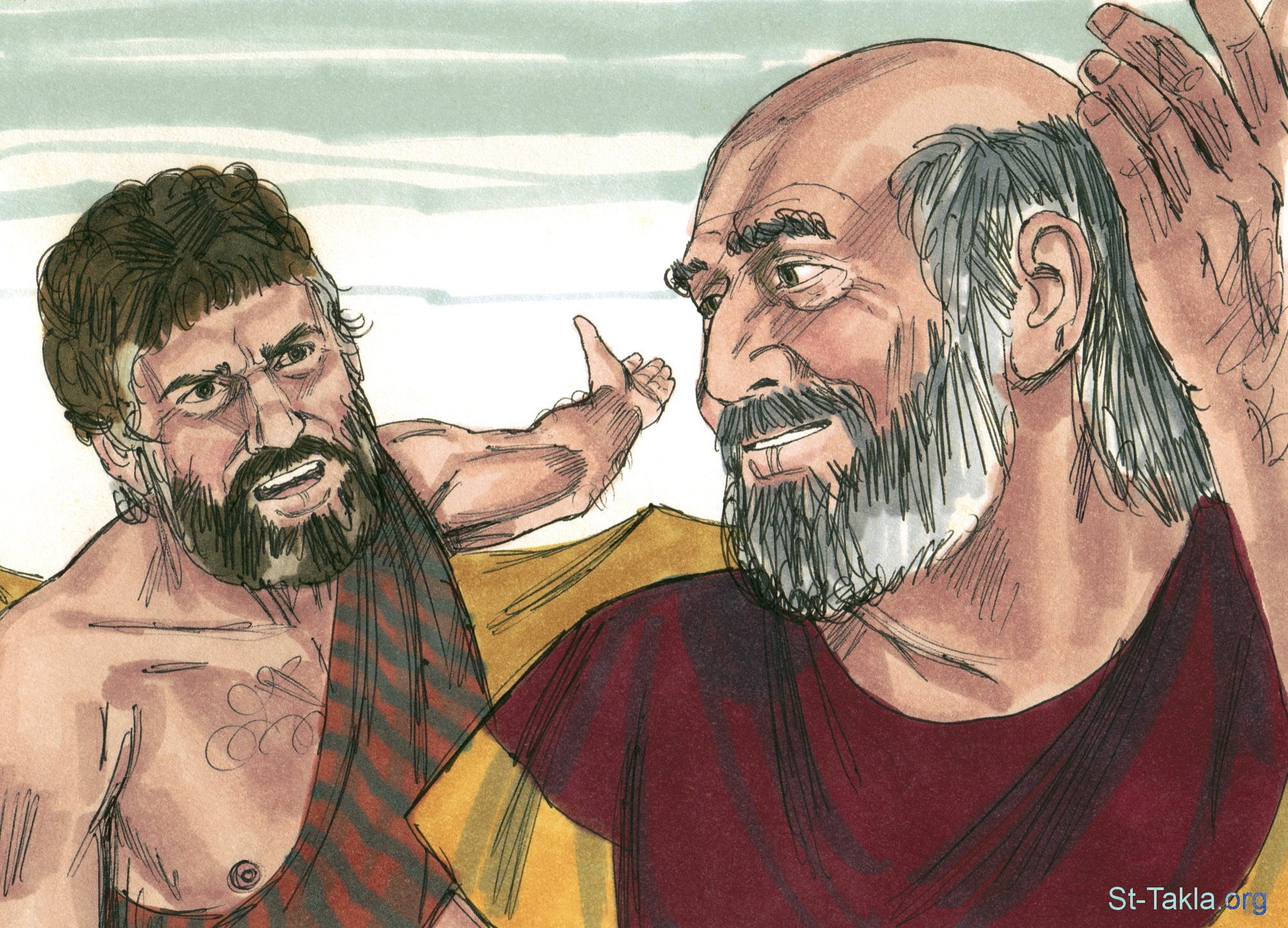"فقال للابان: «ما هذا الذي صنعت بي؟ أليس براحيل خدمت عندك؟ فلماذا خدعتني؟». فقال لابان: «لا يفعل هكذا في مكاننا أن تعطى الصغيرة قبل البكر. أكمل أسبوع هذه، فنعطيك تلك أيضا، بالخدمة التي تخدمني أيضا سبع سنين أخر»" (التكوين 29: 25-27) - مجموعة "خداع إسحق في زواجه" (التكوين 29: 1-35) - صورة (11) - صور سفر التكوين، رسم جيمز بادجيت (1931-2009)، إصدار شركة سويت ميديا.