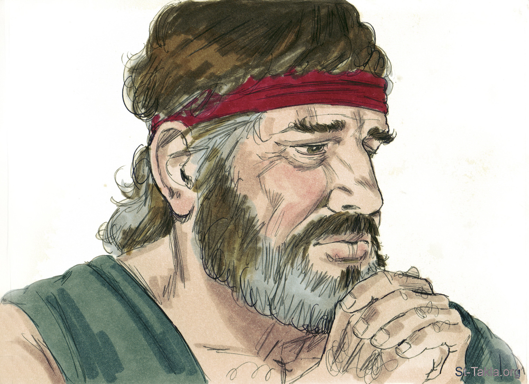 "وقال يعقوب: «يا إله أبي إبراهيم وإله أبي إسحاق، الرب الذي قال لي: ارجع إلى أرضك وإلى عشيرتك فأحسن إليك. صغير أنا عن جميع ألطافك وجميع الأمانة التي صنعت إلى عبدك. فإني بعصاي عبرت هذا الأردن، والآن قد صرت جيشين. نجني من يد أخي، من يد عيسو، لأني خائف منه أن يأتي ويضربني الأم مع البنين. وأنت قد قلت: إني أحسن إليك وأجعل نسلك كرمل البحر الذي لا يعد للكثرة»" (التكوين 32: 9-12) - مجموعة "يعقوب يتقابل مع عيسو مرة أخرى" (التكوين 32: 1 - التكوين 35: 28) - صورة (5) - صور سفر التكوين، رسم جيمز بادجيت (1931-2009)، إصدار شركة سويت ميديا.